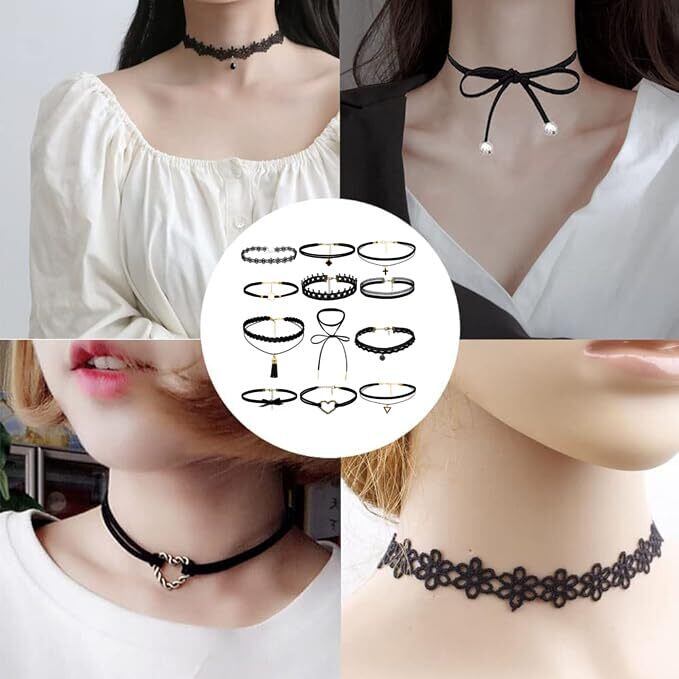 【人気商品】[YaoooosF] チョーカー ネックレス 黒 12点セット リリィチョーカー シンプル おしゃれ レディース choker リボン作り 花のレース カジュル ブラックセット 伸縮タイプ ペンダント付き 首輪 アクセサリー | SmartLiving+