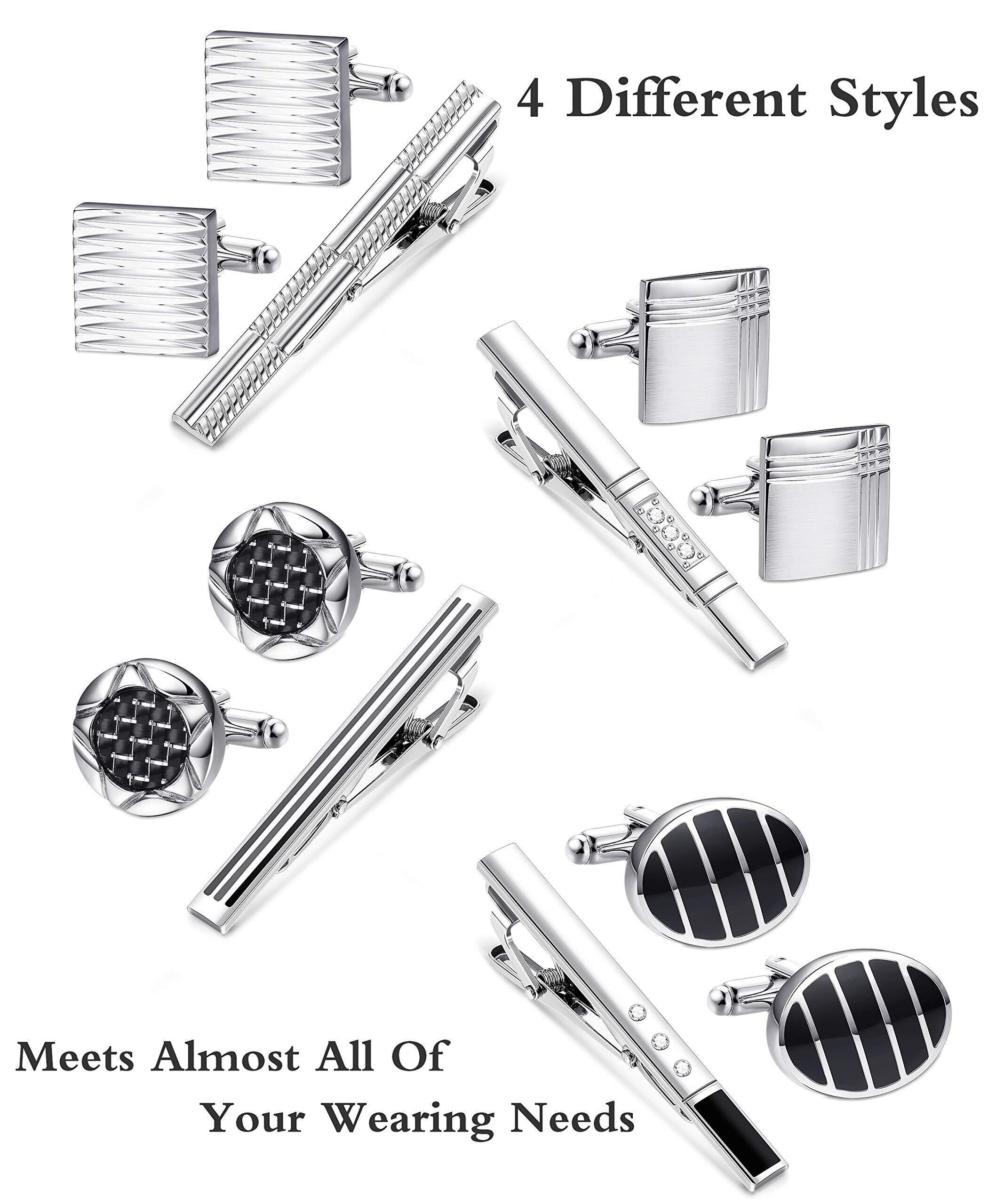 【デザイン】お得な4ペアセットのカフスボタンと4点ネクタイピンです。丁寧に作り上げたカフスボタン。上品フォーマルなセット、二つのデザインがあり、あなたを格上げしてくれます。シンプルなデザインで、ビジネス、デートやパーティなどの時にさりげないお洒落なイメージを魅せる定番のアクセサリーです。