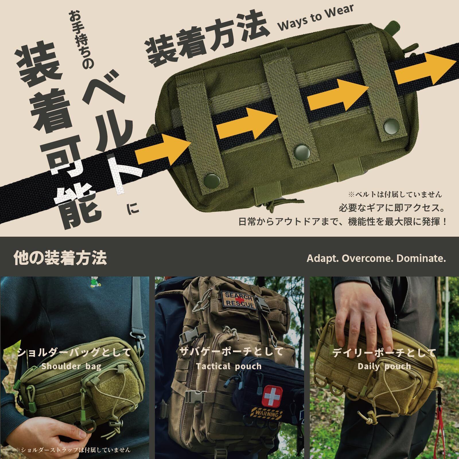 MOLLEシステム対応 MOLLEシステムを採用しており、バックパックや他の装備に簡単に取り付けることができます。また、腰ベルトに通してウエストバッグとして使用可能です。登山、ハイキング、サバイバルゲームに最適です。モーターサイクルや自転車にも簡単に取り付けられます。