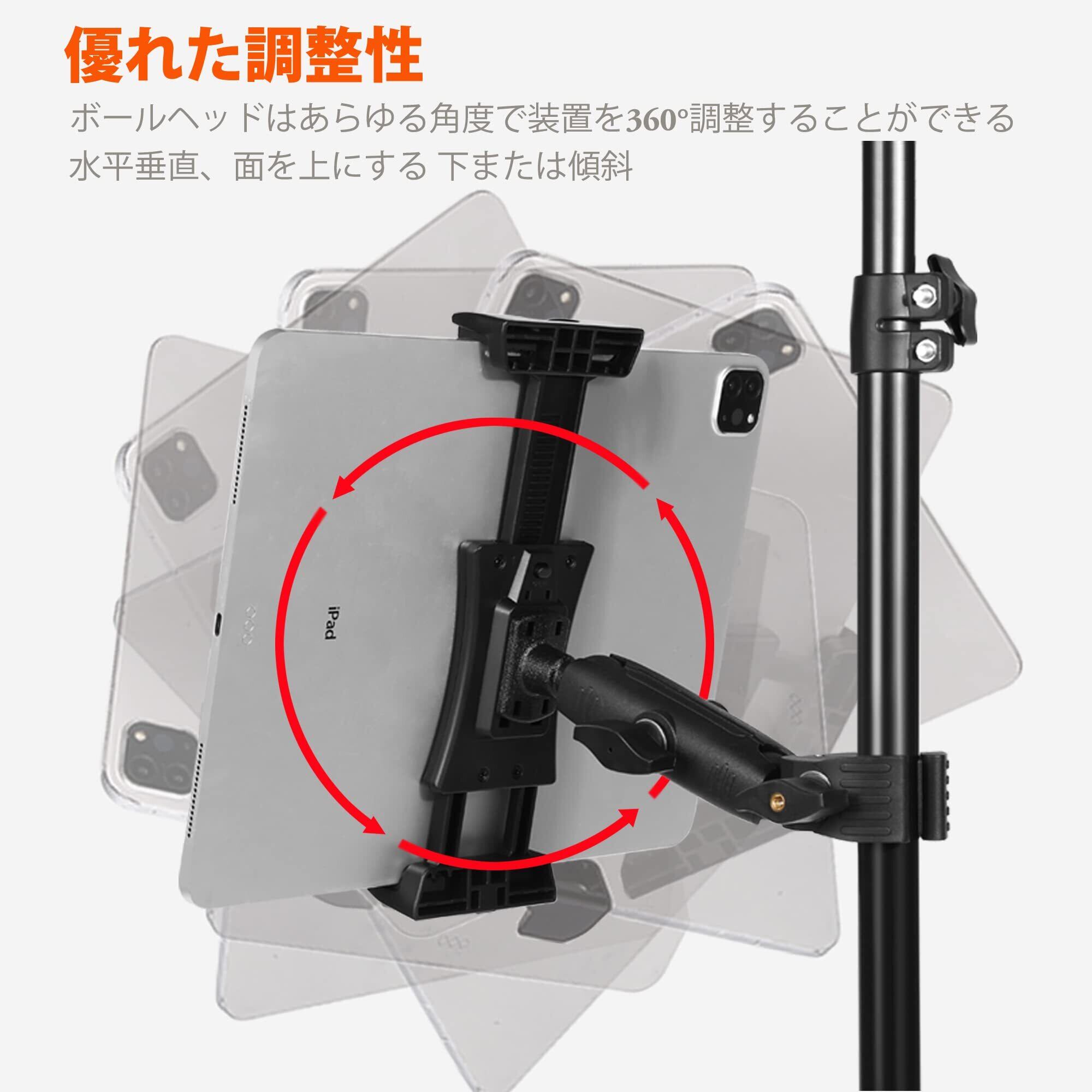 【音楽に特化した設計】-このiPadスタンドはマイク音楽スタンドのために設計されており、曲の歌詞やコードを表示したり、バックグラウンドの曲をトリガしたり、音楽ビデオ番組の録画を容易にしたりするために、マイクスタンド、ハンガー、音楽スタンド、シンバルスタンドとしてポールに挟んだりするだけで、任意の視点に簡単にiPadを調整できます。合唱団の授業、結婚式、コンサート、パーティー、会議で音楽を再生し、共有するなど、多くの場面で使用されています。最大荷重:1.0 kg/2.2 lb