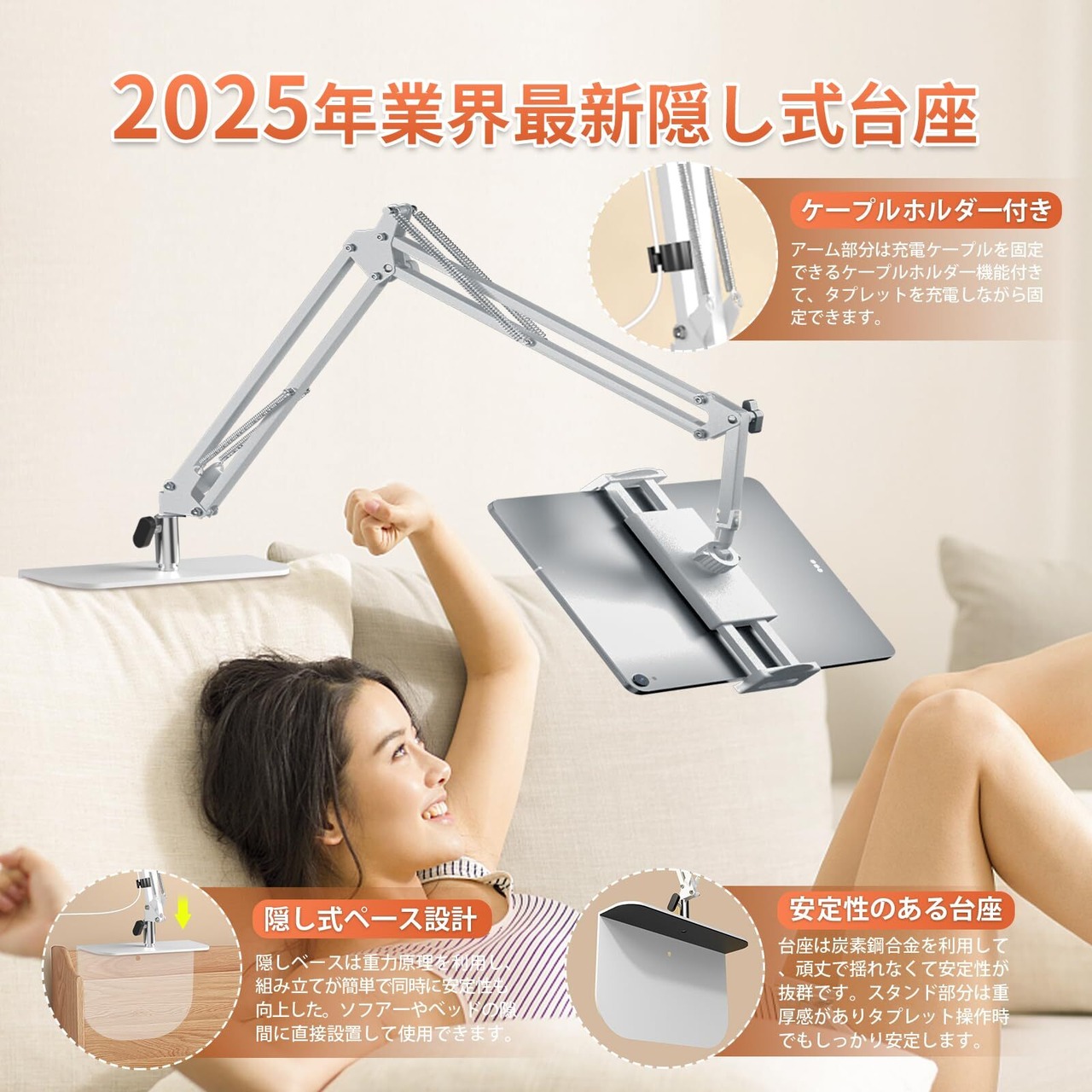 【2025最新設計版隠し式土台・安定感抜群・クランプ要らない】 お客様からのフィードバック「家具をを損害し、突起の部分が頭にぶつかりやすく、倒れやすく、見栄えがしない」に基づいて、私たちはこの最新型、隠し式のベースを設計しました。これらの問題を完璧に解決した。隠しベースは重力原理を利用し、組み立てが簡単で同時に安定性も向上した。最大荷重1.8kg、転倒や落下を防ぎ、安心して利用することができます。 アームはケーブルホルダーが用意され、充電しながら使用できます。また土台内側はゴム付き、使用中にタブレットやスマホの表面を傷付けません。
