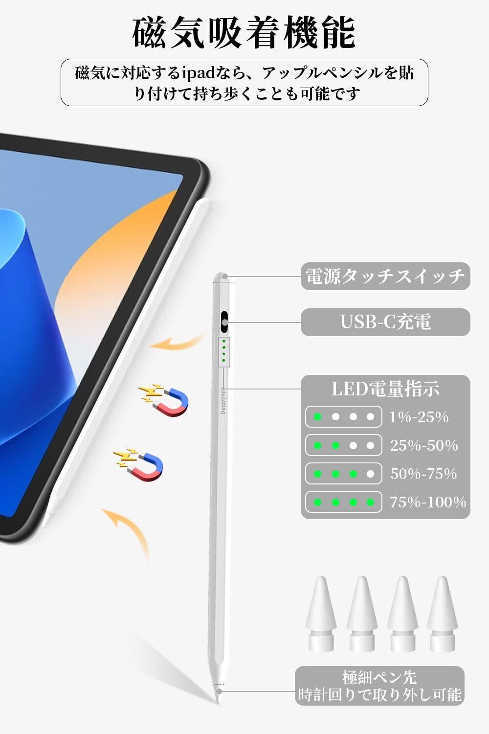 Detoypapa タッチペン iPadペンシル アップルペンシル パームリジェクション/磁気吸着/傾き感知/高感度/交換ペン先4個付き 2018年~2025年iPad対応 軽量 耐摩 たっちペン Type-C急速充電 スタイラスペン 学生 デザイン用 ドローイング用 ホワイト