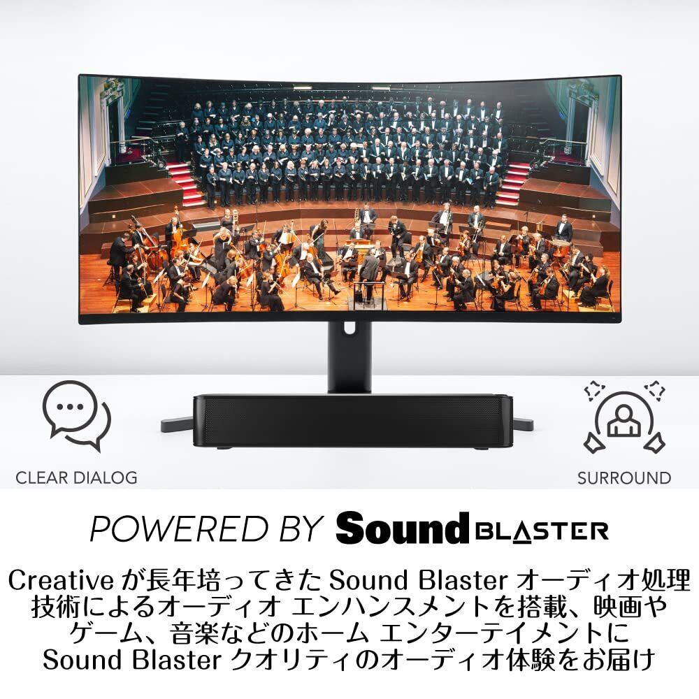 Creativeが長年培ってきたSound Blasterオーディオ処理技術によるオーディオ エンハンスメント - インテリジェントなアルゴリズムによってボーカルやセリフなどの人の声をよりクリアーにする「Clear Dialog」と、ワイドな臨場感を生み出す「Surround」を搭載しており、映画やゲーム、音楽などのホーム エンターテイメントにSound Blasterクオリティのオーディオ体験をお届け
