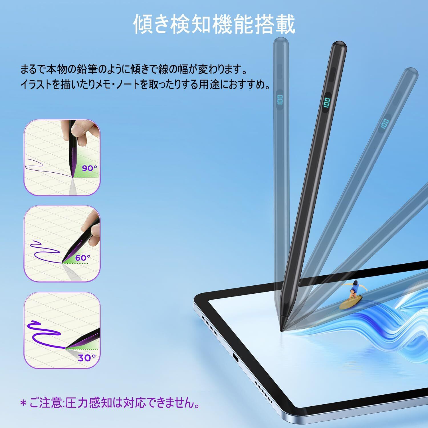 【傾き検知機能スタイラスペン】傾き検知機能が搭載されており、まるで本物の鉛筆のように傾きで線の幅が変わります。イラストを描いたりメモ・ノートを取ったりする用途におすすめ。