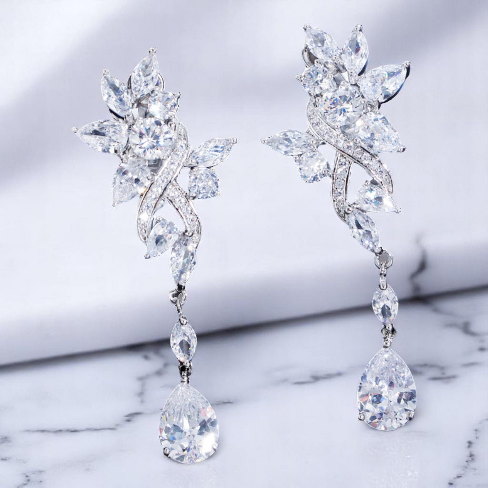 デザイン: 繊細なフラワーモチーフとティアドロップクリスタルが組み合わさった優雅なデザイン、ブライダルジュエリーとして最適です