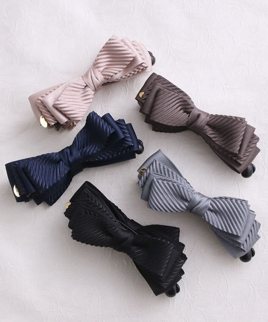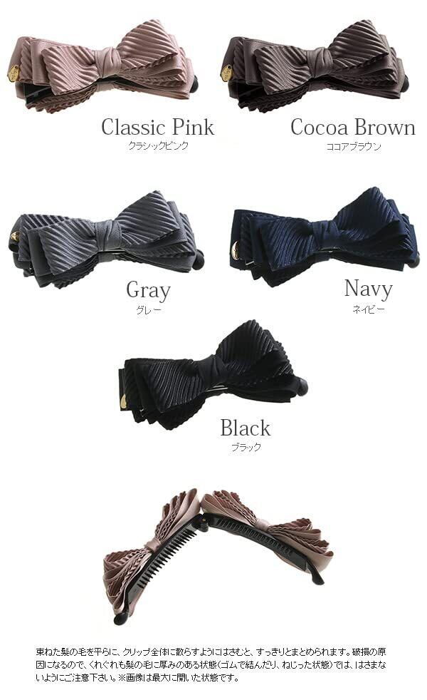 サテンリボンが上品&可愛らしい印象のバナナクリップ。主張しすぎない色合いも嬉しいポイントです。型押しされたストライプ模様のリボンを重ねてきちんと感も演出。女性らしい雰囲気が高まるクラシックピンクからオフィススタイルにも使えるブラックまで、幅広く活躍する全5色展開。気分やシーンに合わせて選べる逸品です。