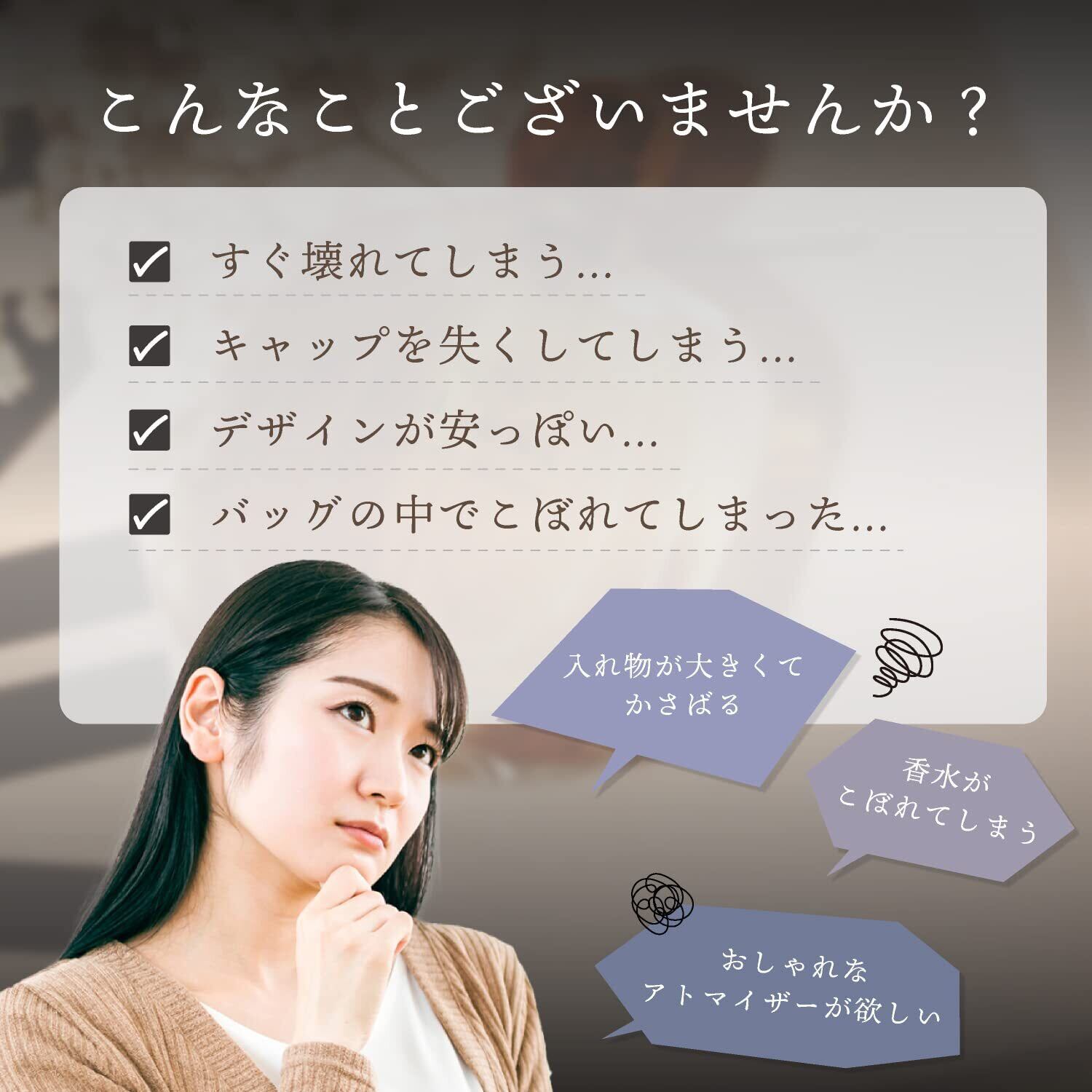【商品仕様】こんなことございませんか? お肌が乾燥して化粧水が常にほしい時。でも化粧水自体が大きい入れ物がほとんどの為持っていくにもかさばってします。 デートの際、準備の時は香水をつけていくが、飲食店などで匂いが肌や服についてしまった時にもう一度香水を振りたい時。 当店の品のあるアトマイザーに詰め替えて常に持ち歩くことで、いい状態を保てます。
