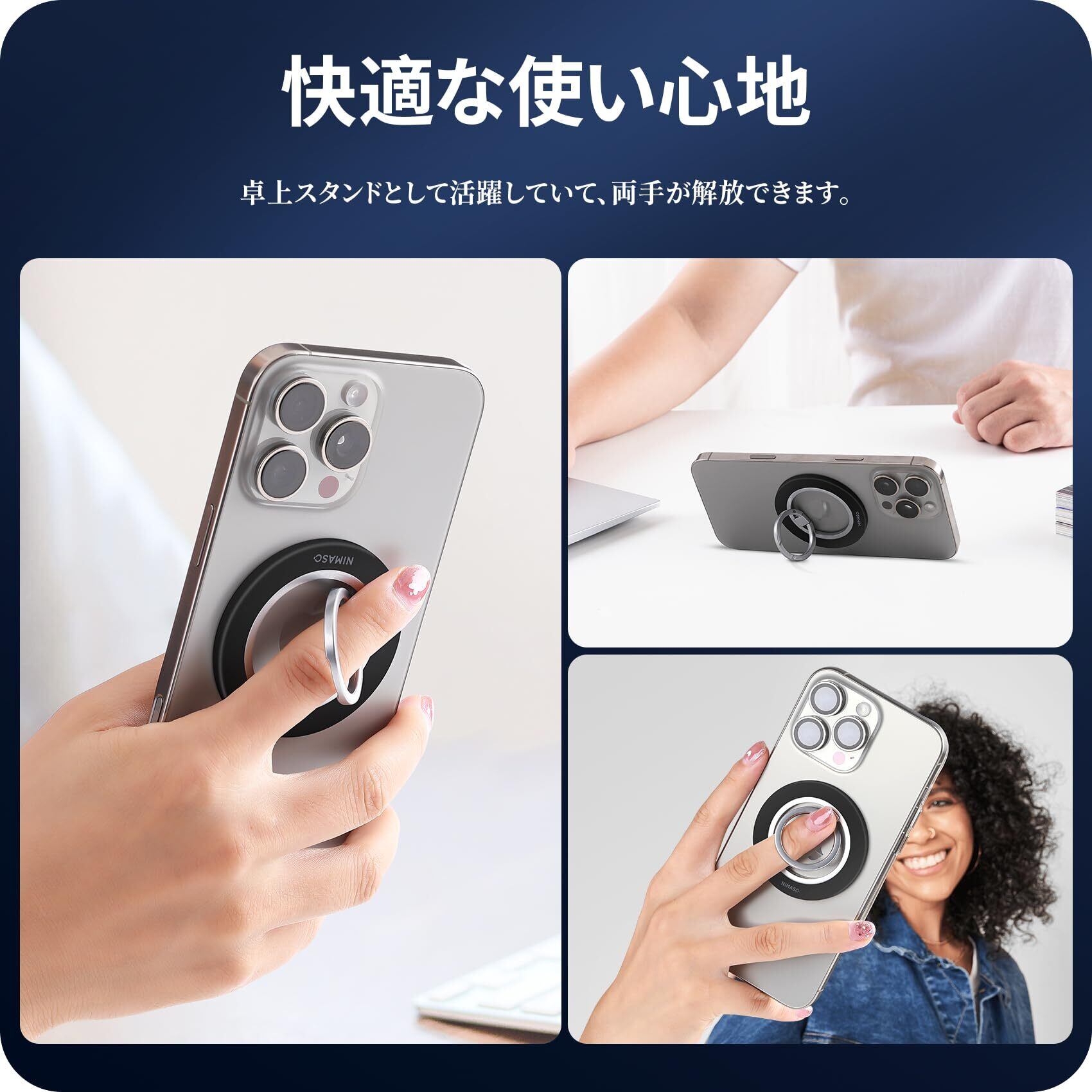【数量限定】NIMASO 360度回転式 スマホリング MagSafe対応 マグセーフ リング マグネット式 スマホ落下防止 角度調整 スタンド機能 磁気増強 メタルリング付き iPhone16/15シリーズ、Androidなど全機種対応(ブラック) | SmartLiving+