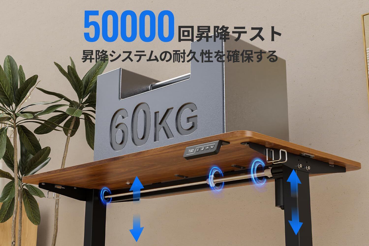 【50,000回以上の耐久性試験済み昇降デスク】この電動昇降デスクは産業用レベルのスチールフレームと固体ラミネートの組み合わせた頑丈なフレームを使用し、T字型の足は非常に安定してサポートしています。50000回の昇降テスト済みも安定性と安全性を保ち、ヘビーユースにも耐えられる昇降式デスクです。
