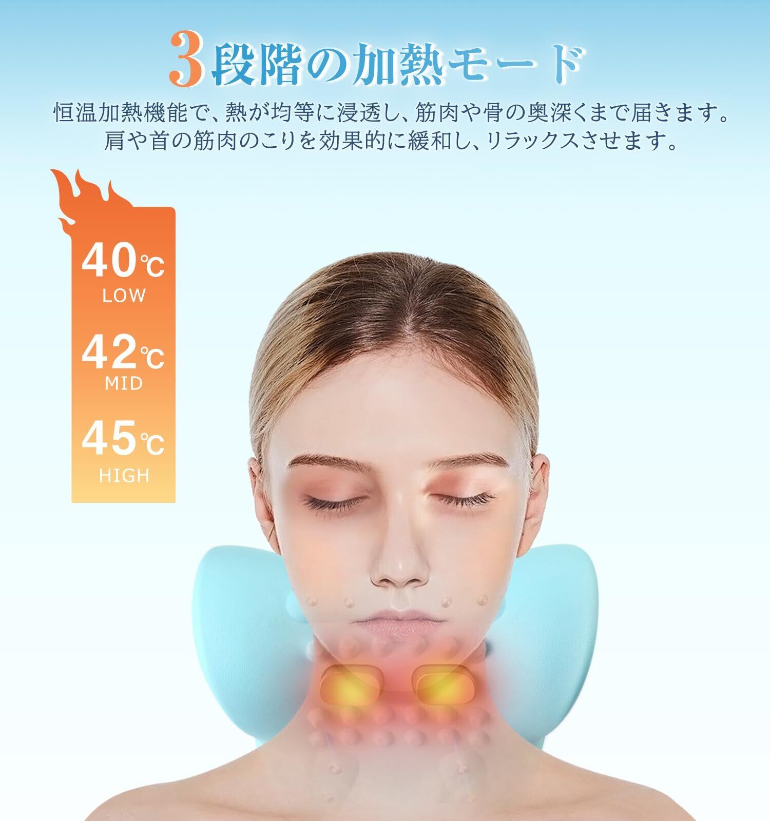 「3段階の加熱&3段階の振動」長時間のデスクワークやスマートフォンの使用で、首周りが重く感じることはありませんか?本製品は、首元を快適にサポートするために、40℃・42℃・45℃の3段階加熱機能を搭載。心地よい温かさがじんわりと広がり、寒い季節やリラックスタイムにも最適です。また、3段階の振動モードにより、異なるリズムでやさしく刺激を伝え、首の奥深くまでしっかりアプローチ。お好みに合わせた設定が可能で、毎日のケアを手軽にサポートします。