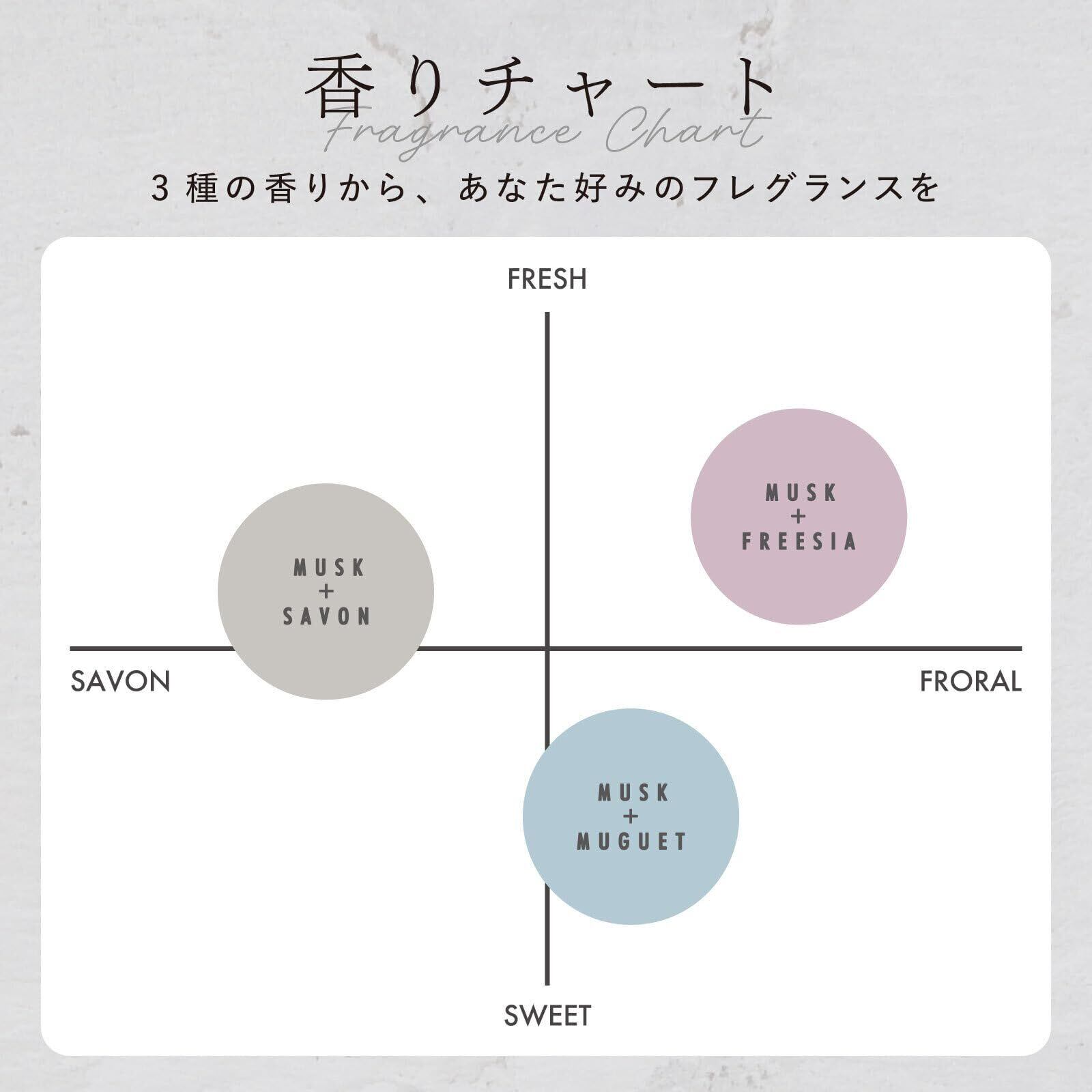 フレッシュな果実と花々、ムスクの優しさが洗いたてのリネンのようなサボンと混じり合う心地よい香り