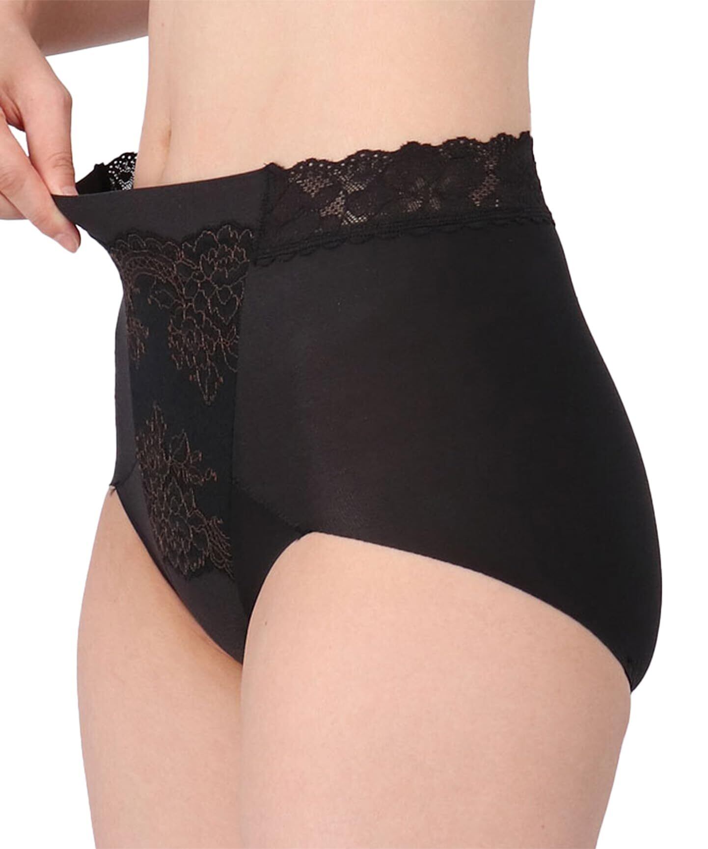 ●ほどよくおなか押さえ フロント部分はレースでほどよくおなかを押さえる