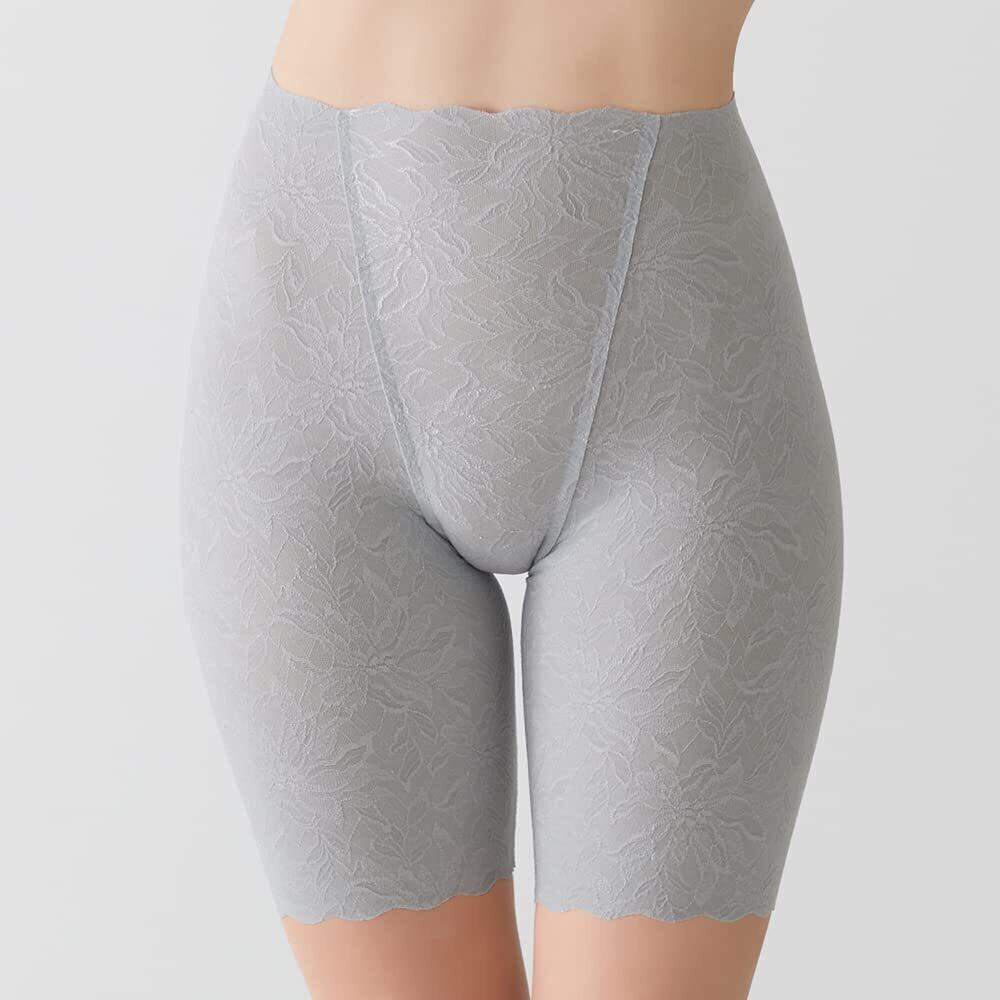 生地端にゴムがないカットオフストレッチレースで肌への圧迫は少なく、お腹周りとヒップラインをしっかりカバー。 ヒップ下に段差が出来にくく、痩せ見え効果あり。