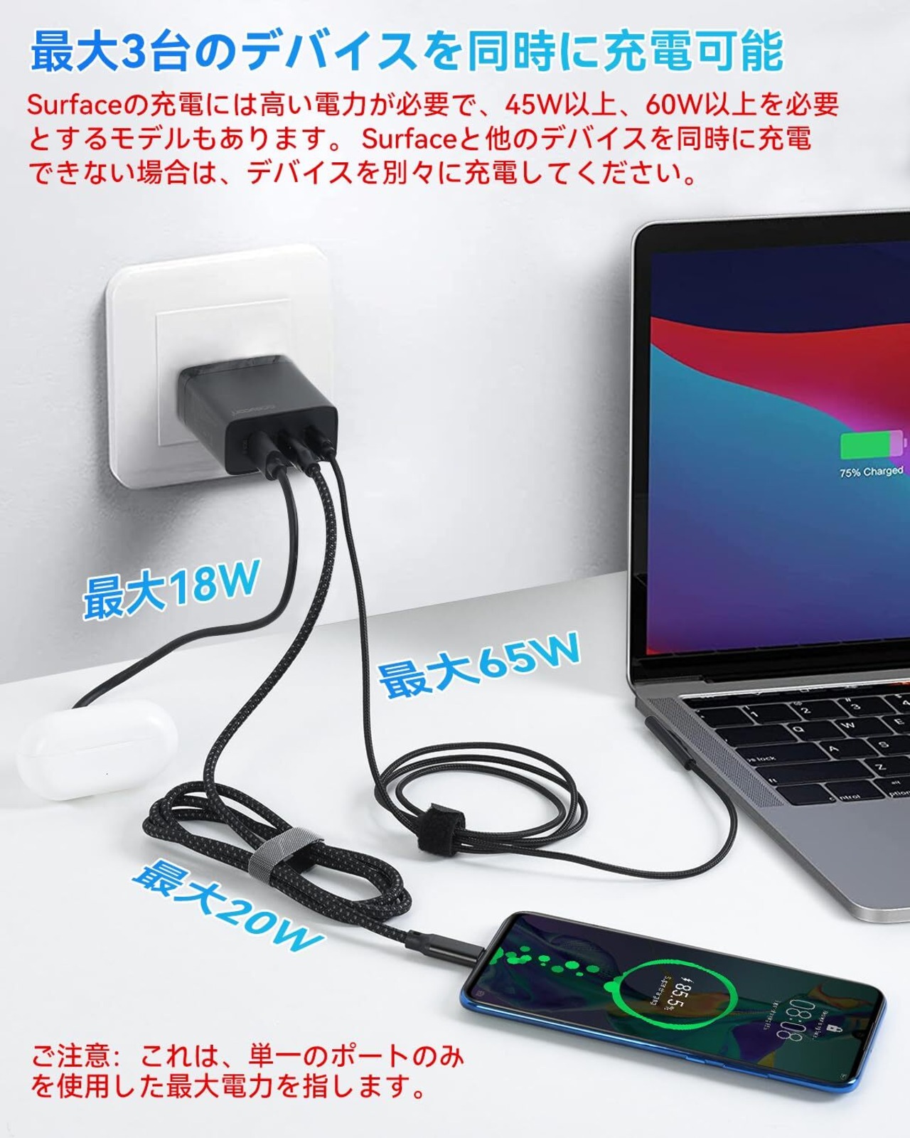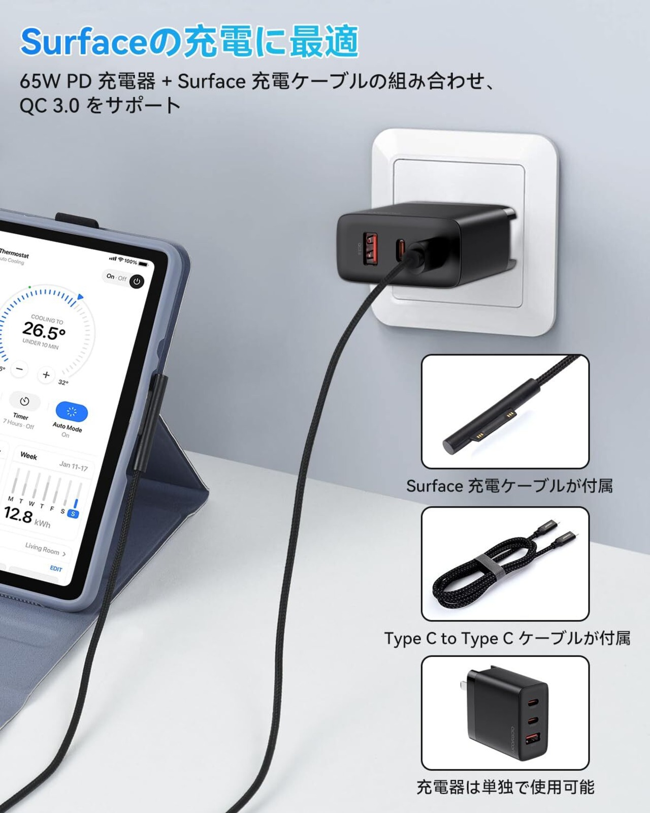【特価商品】aceyoon PD3.0 充電器 65W 折り畳み 1.2M Surface + USB C 充電ケーブル付き ACアダプタ 3ポート(USB-C*2とUSB-A*1) GaNII窒化ガリウム 【PSE認証済み】 サーフェス充電 for Surface Pro Surface Laptop Surface Go Surface Book など多機種対応 超軽量 極小型 三台同時充電可能 | SmartLiving+