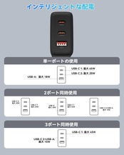 【効率的な充電、3ポート設計】aceyoonのPD充電器はUSB-Cポート2つとUSB-Aポート1つを搭載し、急速充電に対応しています。各ポートは最大65W(USB-C)、20W(USB-C)、18W(USB-A)の出力に対応し、複数のデバイスを同時に充電しても最適な充電速度を確保します。