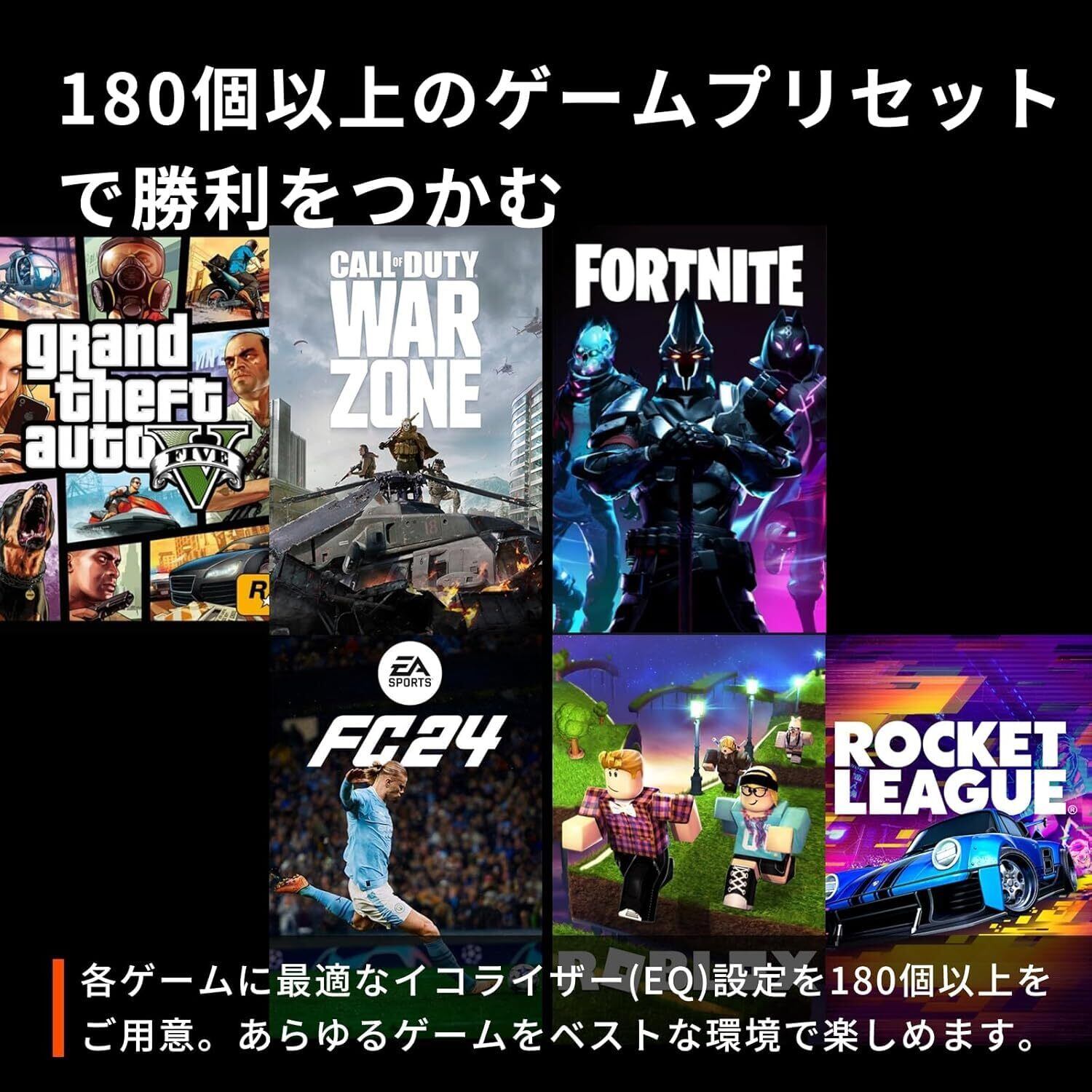 ゲームに最適なプリセットを選択可能:各ゲームに最適なイコライザー (EQ) 設定を100個以上をご用意。あらゆるゲームをベストな環境で楽しめます。