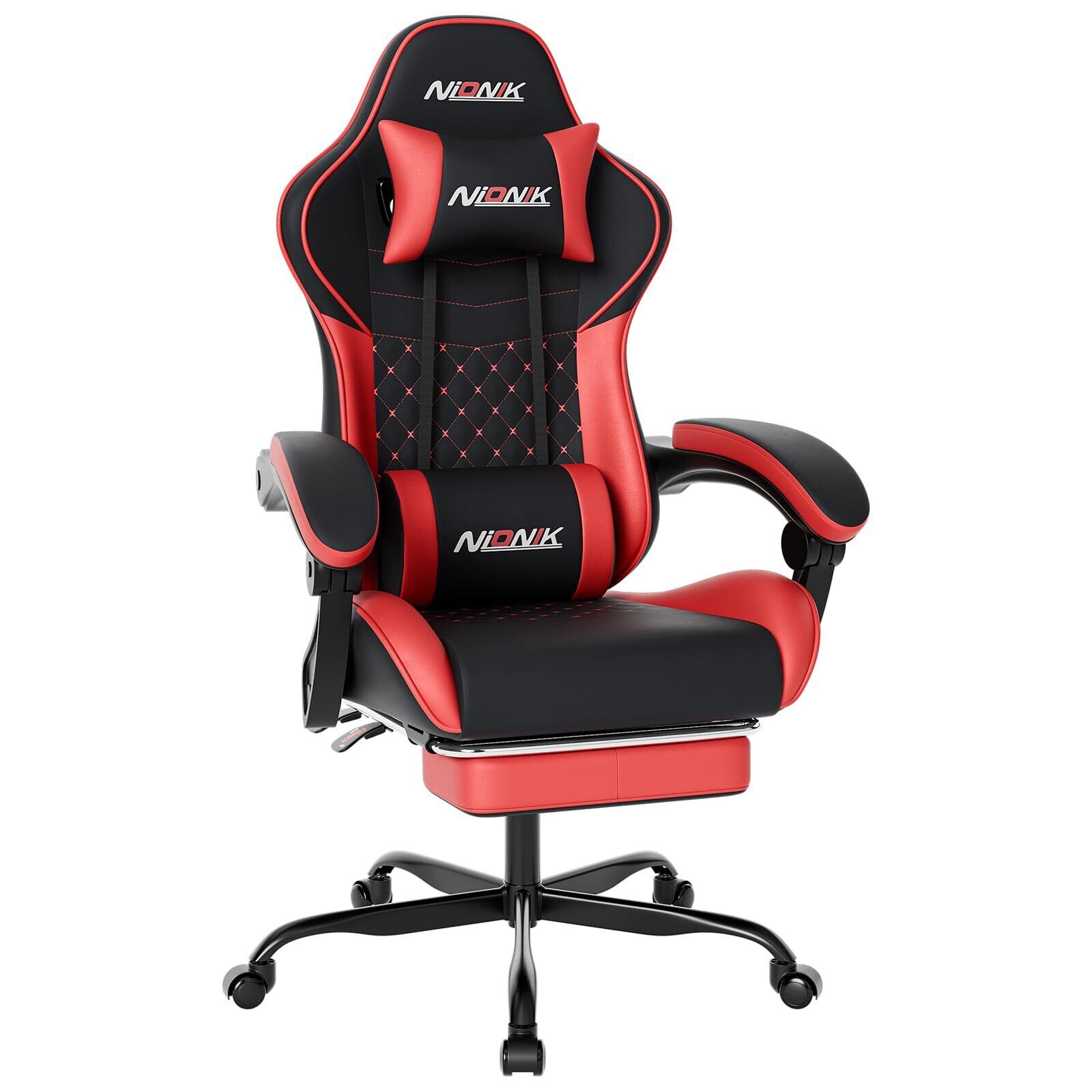NIONIK ゲーミングチェア オットマン付き 幅広座面 オフィスチェア デスクチェア 通気性 人間工学設計 ハイバック 椅子 座り心地 腰痛対策 gaming chair テレワーク あぐら 135°リクライニング パソコンチェア 高さ調節 連動アームレスト PCチェア ダイア調に蝶の刺繍のデザイン 蒸れない PUレザー 高耐久性 (レッド)