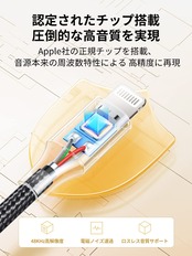 【高品質素材・安定性向上】Apple社が認証したコネクターを採用、Pin端子が革新されたロジウム・ルテニウムメッキ技術により、汗や油等の付着による端子部分の劣化など故障を防止して使用寿命を長続き!内部には粗い錫メッキ無酸素銅線コアを採用、効率的な伝送と安定した信号を確保して、より快適な体験を実現します。