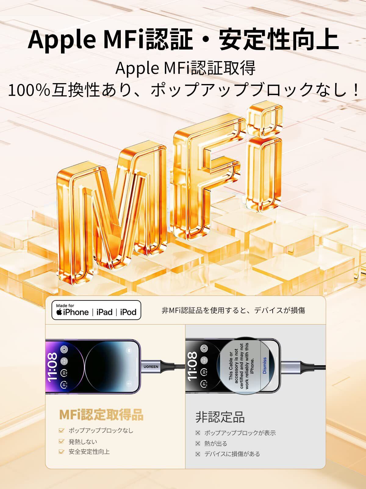【MFi認証取得・優れた互換性を確保】本製品ライトニング イヤホンジャックはMFi認証取得で、Apple純正のLightningコネクター(C101)を採用していることにより、iPhone/iPadへの損傷なく100%の互換性が実現。※iPhone 14シリーズを含む、iOS 10以降に対応するのも魅力!(UGREENのMFi認識取得型番:6957303837564)