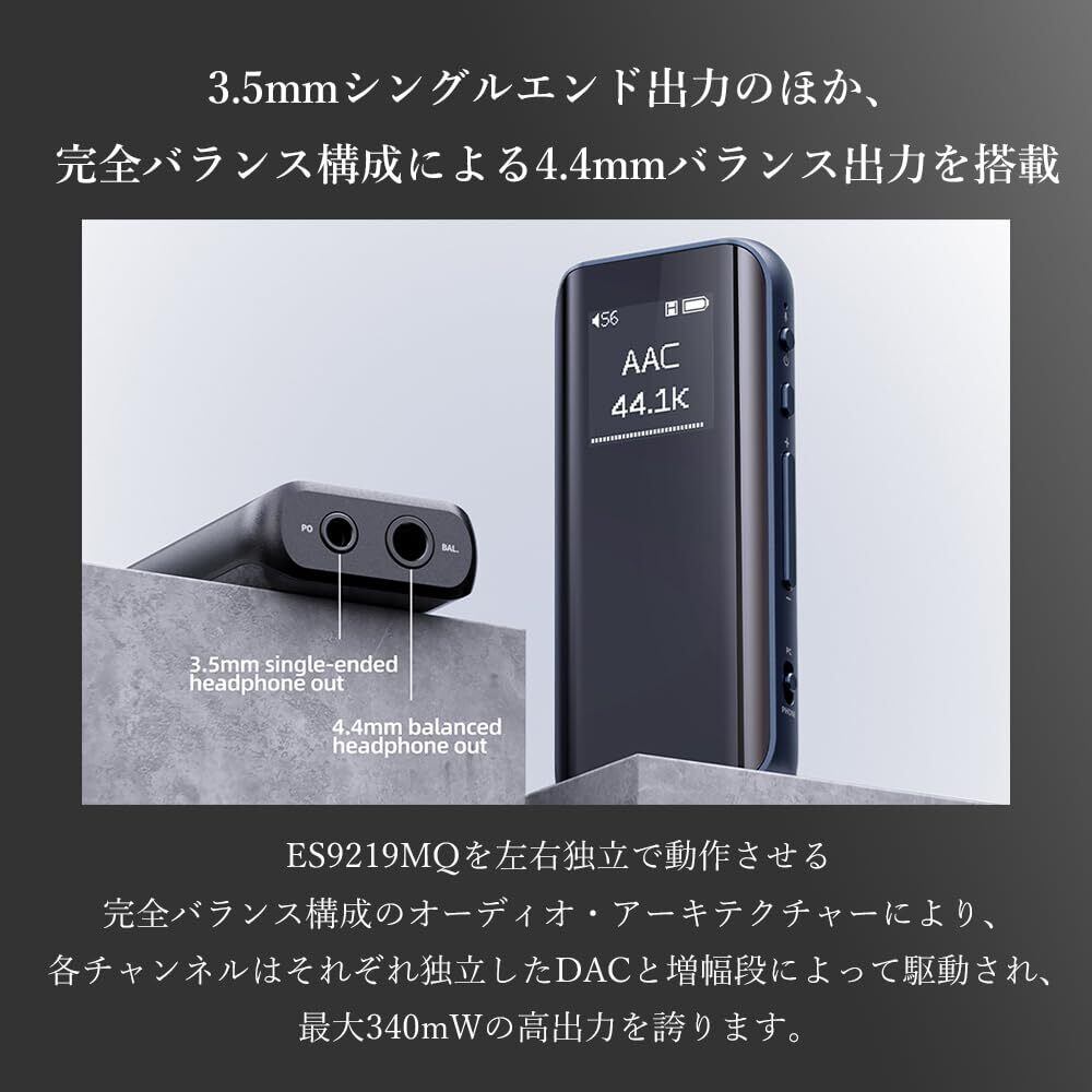 3.5mmシングルエンド出力のほか、完全バランス構成による4.4mmバランス出力を搭載:BTR15は一般的な3.5mmシングルエンド出力だけでなく、4.4mm端子によるバランス出力を備えています。 ES9219MQを左右独立で動作させる完全バランス構成のオーディオ・アーキテクチャーにより、各チャンネルはそれぞれ独立したDACと増幅段によって駆動され、最大340mWの高出力を誇ります。