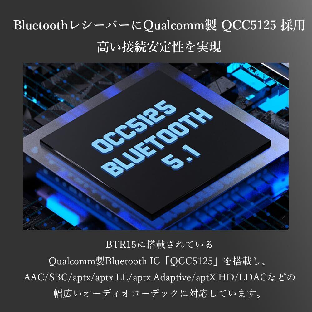 BluetoothレシーバーにQualcomm製「QCC5125」を採用し、高い接続安定性を実現:BTR15に搭載されているQualcomm製Bluetooth IC「QCC5125」を搭載し、AAC/SBC/aptx/aptx LL/aptx Adaptive/aptX HD/LDACなどの幅広いオーディオコーデックに対応しています。