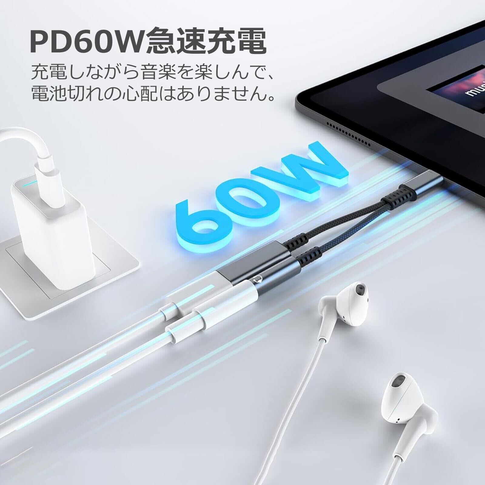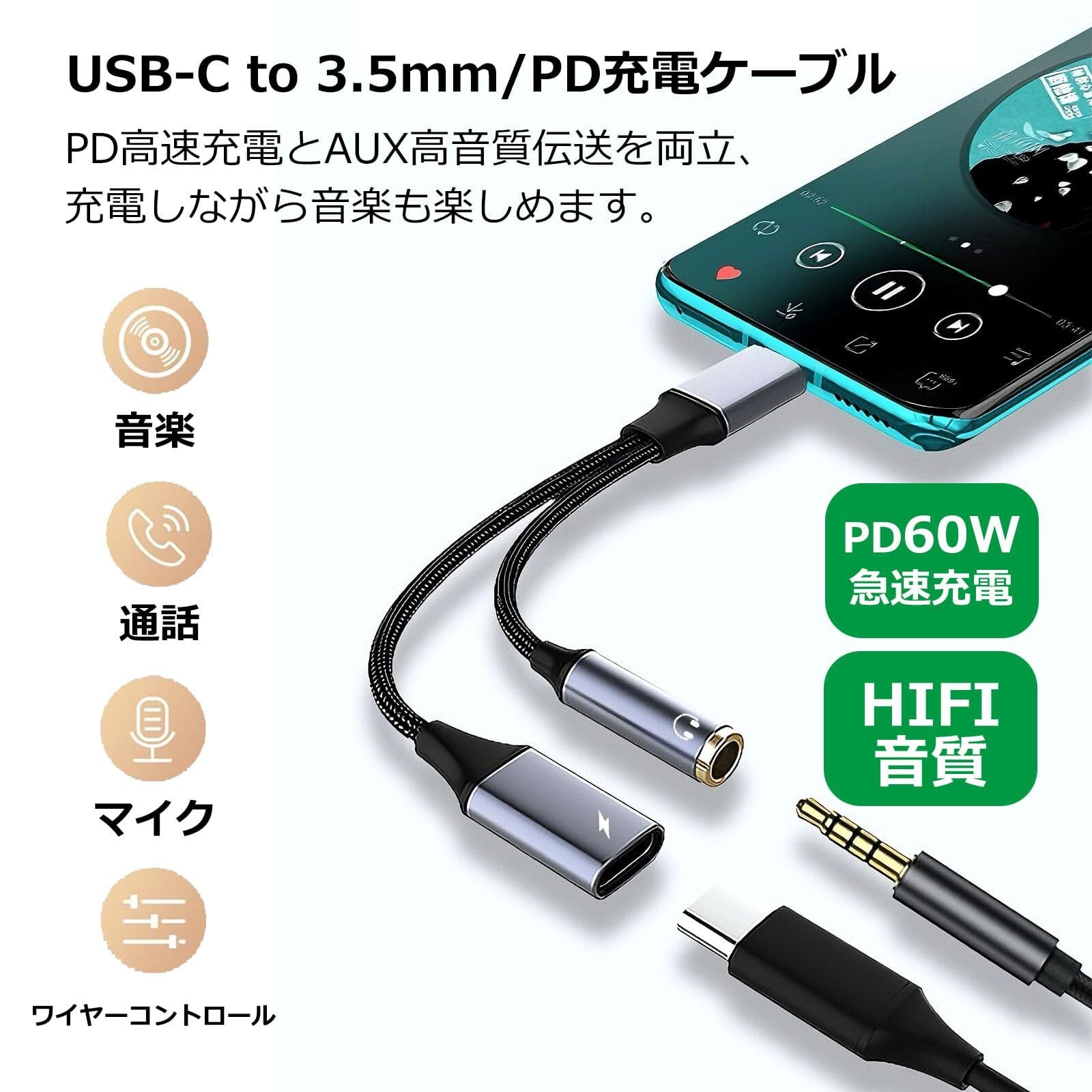 【主な特長】 ● 充電&オーディオ同時使用可能 ● PD 60W高速充電対応 ● Hi-Res高音質再生 ● 3.5mmイヤホン/ヘッドホンに接続 ※充電ポートはデータ転送非対応