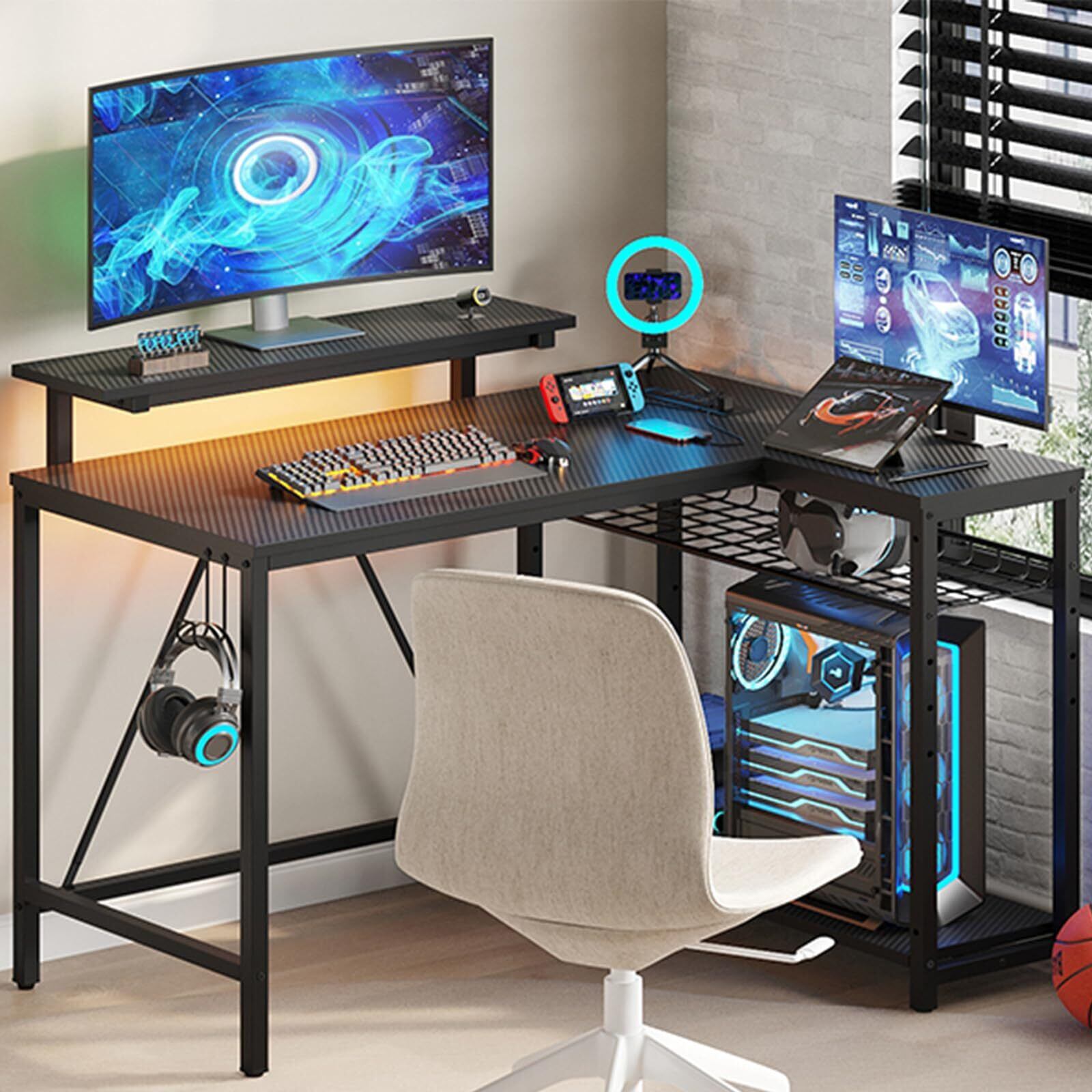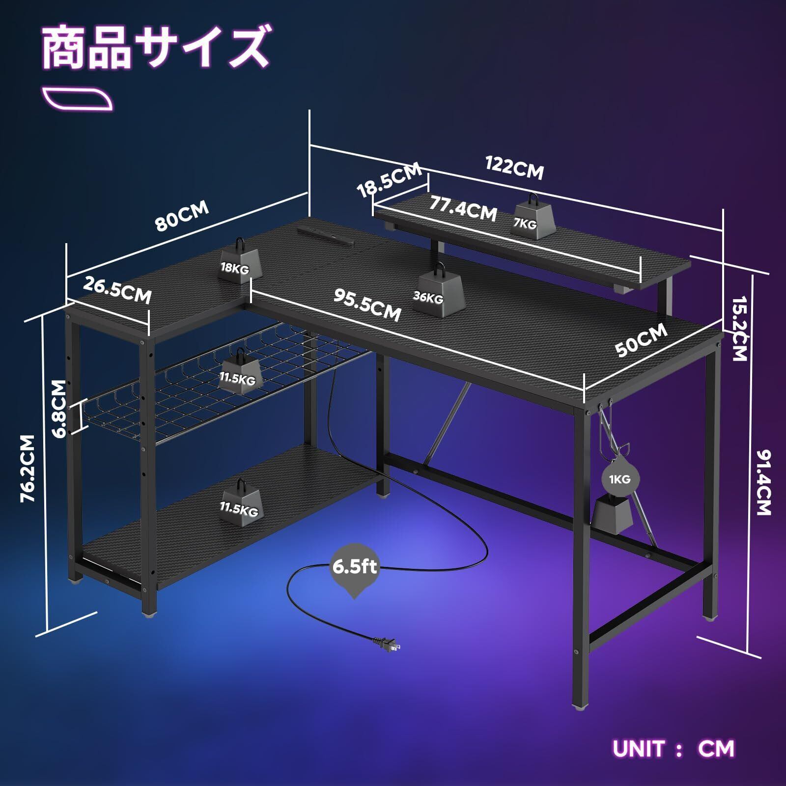 Bestier ゲーミングデスク L字デスク コンセント付き 幅122cm USB-C対応 パソコンデスク 机 pcデスク L字型 収納ラック付き LEDライト付き 棚板高さ調節可能 モニター台付き ブラック