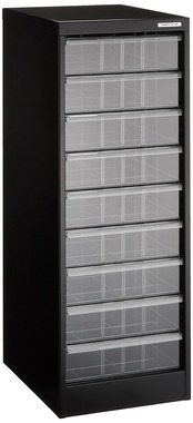 B4サイズ・フロアケース。B4タテ型/深9段×1。材質:本体/スチール(粉体塗装) 引出し/透明スチロール樹脂、 引出し段板/ポリプロピレン。付属品:カラー分類タイトルシール付き
