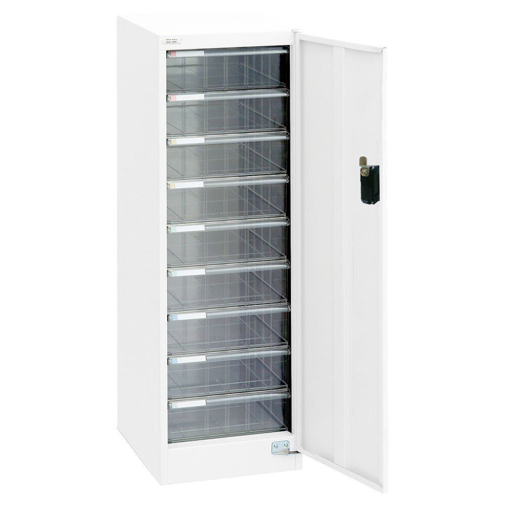 材質:本体/スチール 粉体焼付塗装、焼付引出し/透明スチロール樹脂、引出し段板/ポリプロピレン