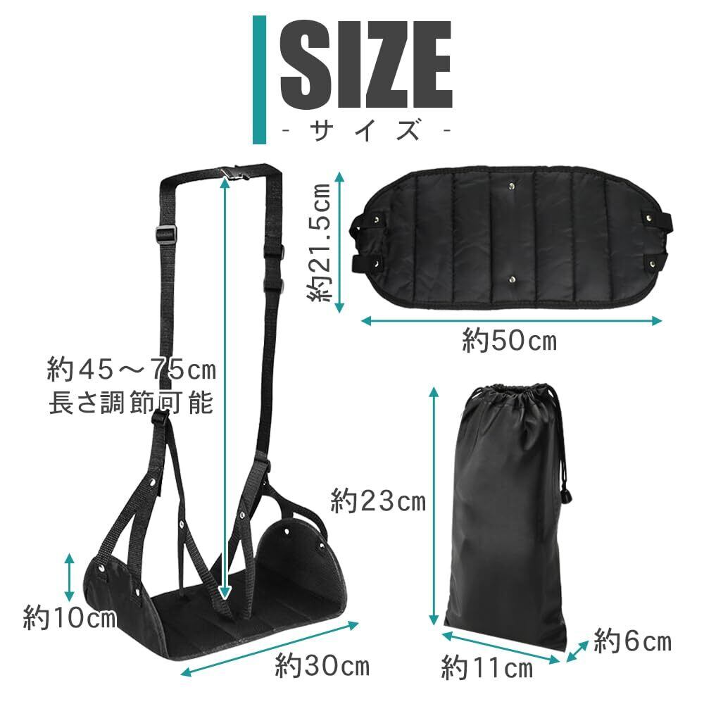 【セット内容】フットレスト×1点 収納袋×1点 【サイズ(約)】フットレストシート:30cm×21.5cm×10cm 全長:45cm~75cm 【カラー】ブラック 【材質】オックスフォード