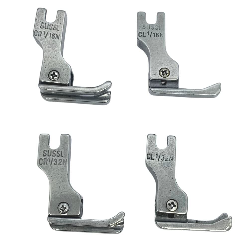 右段付き押え、左段付き押え、それぞれ1mmと2mmの合計4点セットです。工業用ミシン、職業用ミシン専用の押えとなります。家庭用ミシンには取り付けることができませんので、ご注意ください。