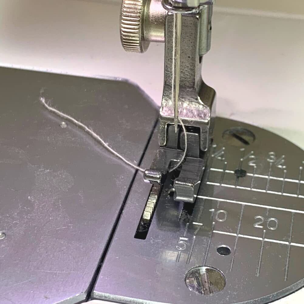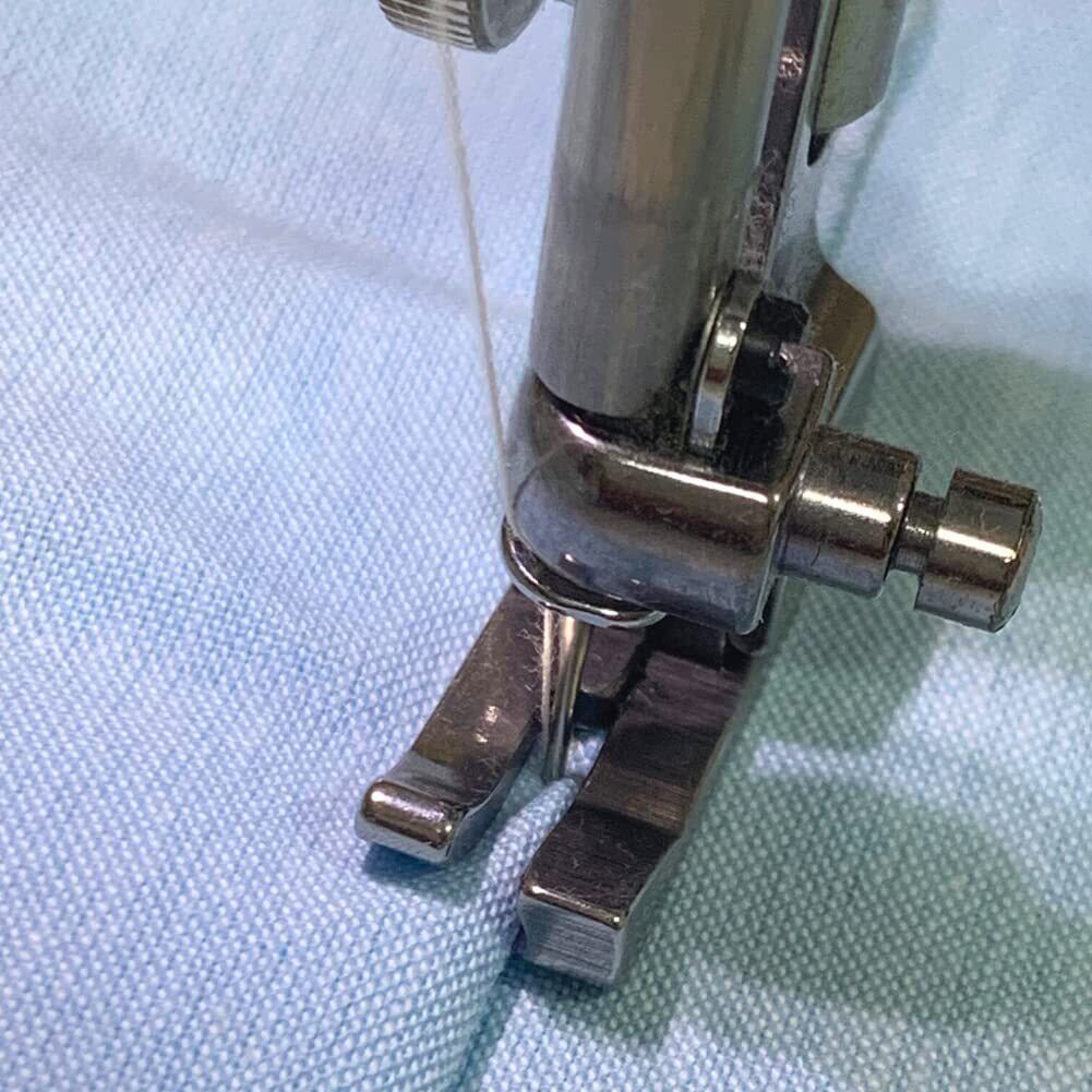 段付き押さえは、押えの段差に生地を当て縫い進めることで、均等間隔で綺麗にステッチをかけることができる便利な押さえです。押えの片側が段差になっており、生地を押さえに合わせて置き、縫い進めていけば、誰でも簡単に生地の端から一定の距離を保ったまま綺麗な均一幅のステッチを縫うことができます。