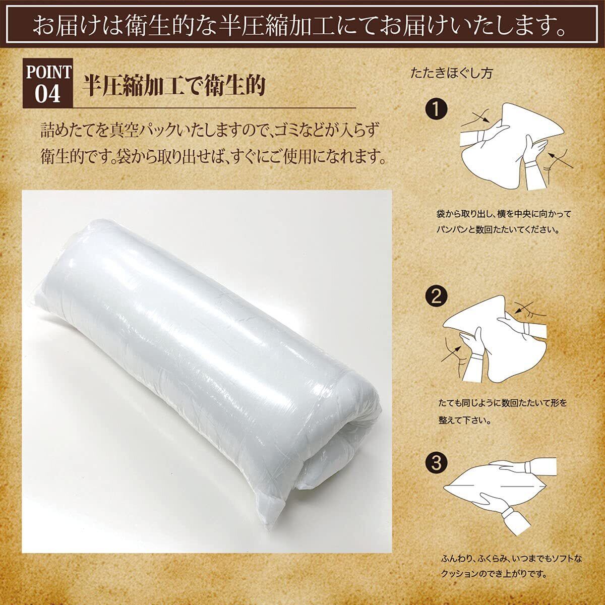 圧縮された状態でお届けしますので、開封されたら手で軽く揉んで形を整えてください。 注意:圧縮につきましては簡易圧縮となりますため膨れることが御座いますが、 品質には問題は御座いません。