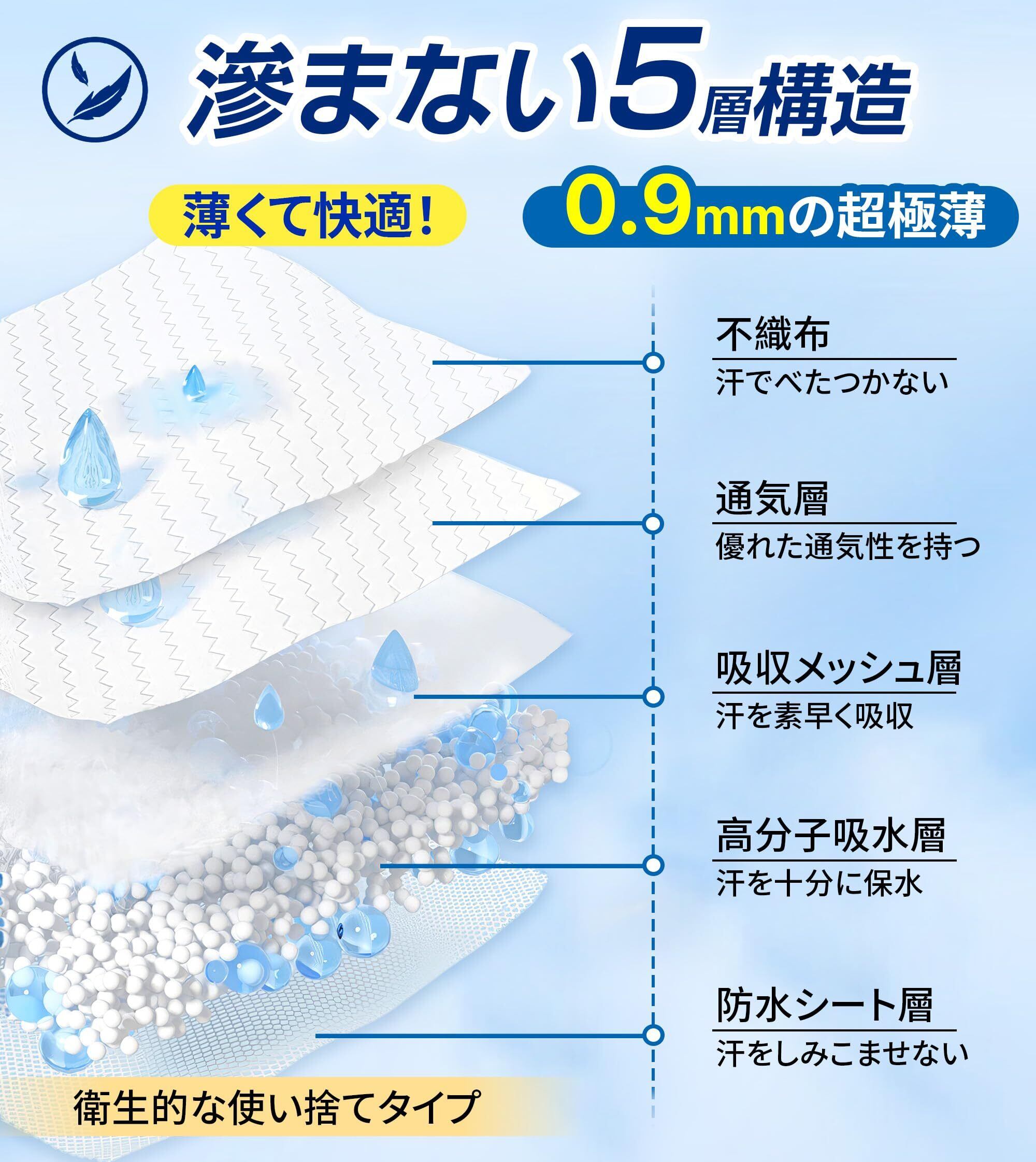 【薄くて快適・はがれない】 厚さわずか1mmの薄型設計で、着けていることを忘れるほど違和感がありません。通気性が確保されており、汗を効率よく吸収します。細かいエッジプレス加工によって、使用中に形が崩れず、安心してご使用いただけます。肌に優しい不織布素材で、薄手でさらっとした肌触りです。使い捨てタイプで衛生的、持ち運びにも便利です。