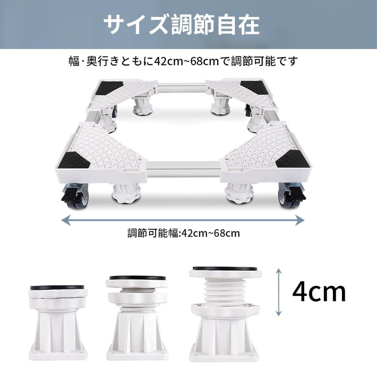 【伸縮可能・高さ調整】ご購入前に洗濯機配置業者へご確認ください(お使いの洗濯機で本製品がご使用可能かどうか)幅調整範囲:42cm~68cm、高さ調整範囲:10cm-14cm、洗濯機や冷蔵庫などの大型家具に合わせて、幅・奥行き・高さを自由に伸縮できます。エアコン、ドラム式や全自動洗濯機、冷蔵庫、食器棚洗濯機、植木鉢、大型機器など、さまざまな家具に使用することができます。