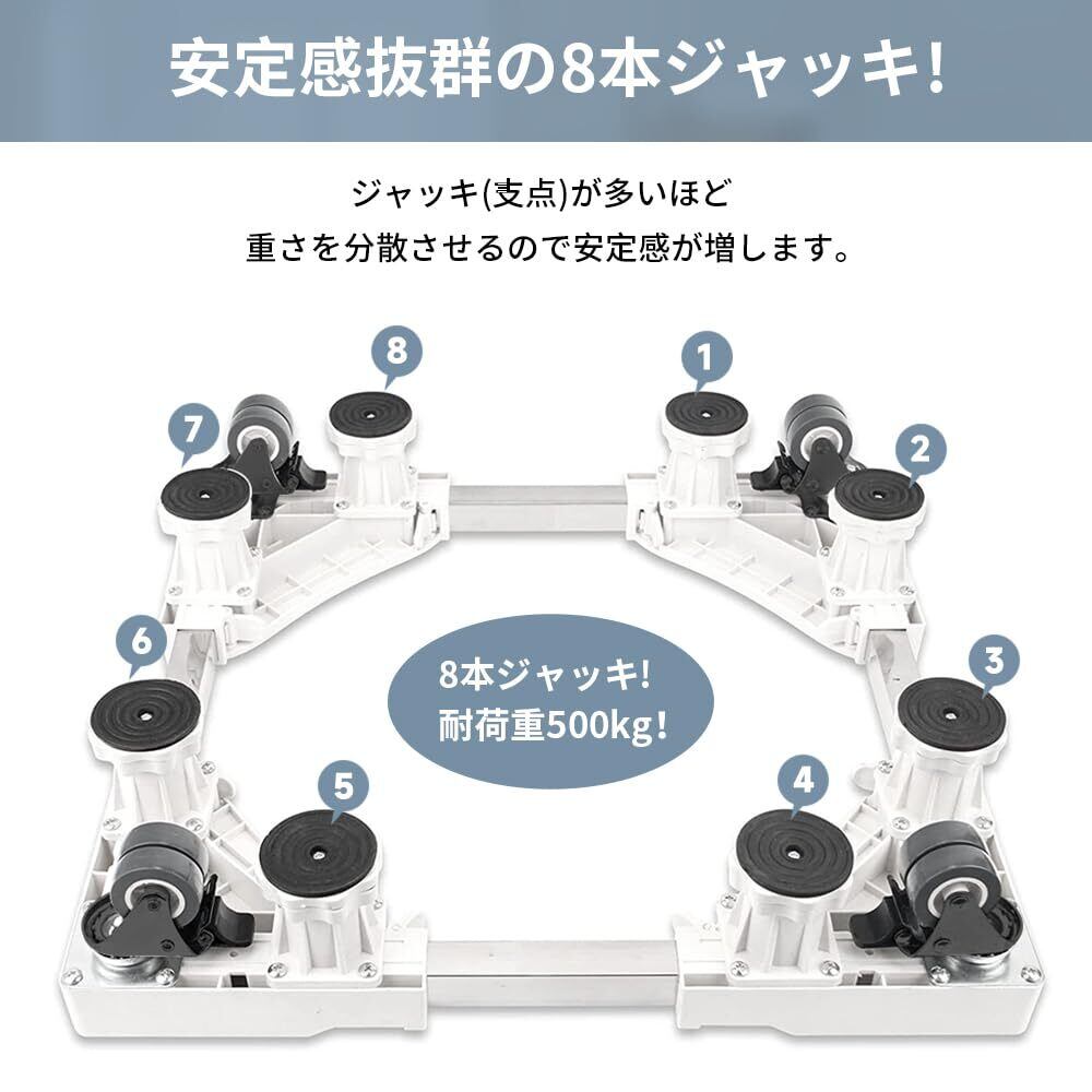 【八足四輪・高品質素材】大型ジャッキ8本、キャスター4本が付き、伸縮可能、高さ調整、移動可能な洗濯機置き台。高品質なステンレス鋼とABS樹脂を採用して、優れた安定性を保ち、腐食に耐えます。360度移動できる,耐荷重を500kgまで実現します。洗濯機や冷蔵庫との接触を有効に防止できし、排水と清掃問題を簡単に解決します。