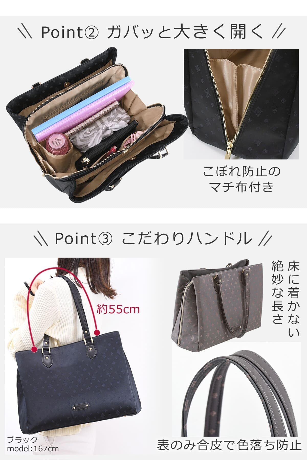 ①マチ広:安定感ありしっかり自立します ②コの字ファスナー:大きく開きファイルも小物もすぐ取り出せる ③上品できれいめデザイン:ラクに通勤、おしゃれに営業。 ④ポケット充実:小物もすっきり収納