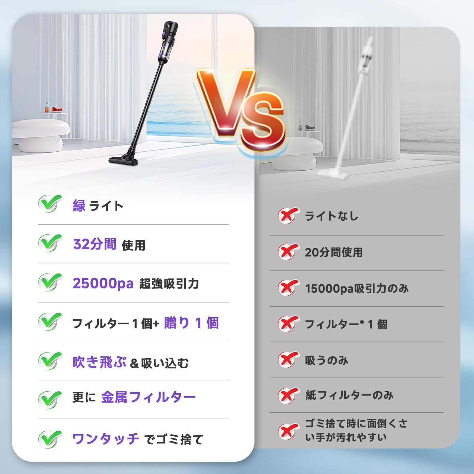️【8000mAh大容量&最大32分連続稼働&Type-C充電】家庭用掃除機は8000mAhの大容量バッテリーが内蔵され、一度の充電で最大32分の連続運転を実現されます。持ち運びもラクで、家中どこでも手軽に使えます。一人用の住まいから、2LDKの部屋も一気にしっかり掃除できます。そして、長くご愛用いただくため、バッテリーには高性能なリチウムイオン電池を採用しました。コードレス掃除機はType-C充電ポートを採用しており、急速充電にも対応。インジケーターライト付きで、充電状態が一目でわかります。充電器は出力5V 2A以上のACアダプターをおすすめします。充電ヘッドはコンピューター、カーチャージャー、アダプター、モバイル電源で便利に充電できます。そして、ほとんどのスマホの携帯用のアダプターと共用できますので、もう「掃除機用のあの充電器」を探す必要はなくなりました。とても便利です!【限定期間キャンペーン】今ご注文いただくと、交換用フィルターセット(3個セット)あるいは掃除機スタンド、掃除機収納バッグがもらえる!(お一人様1回)お気軽に説明書の連絡先よりまでご応募してください!