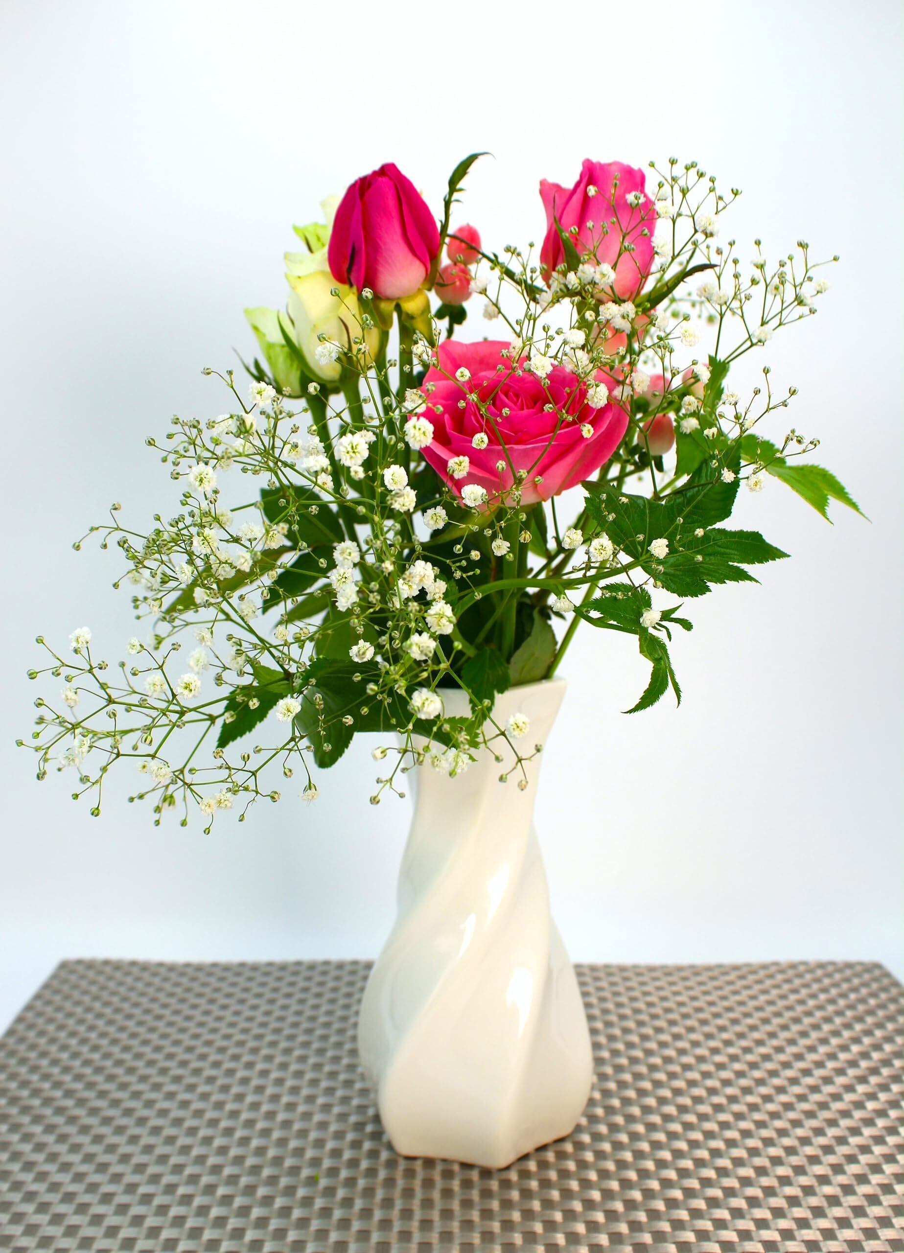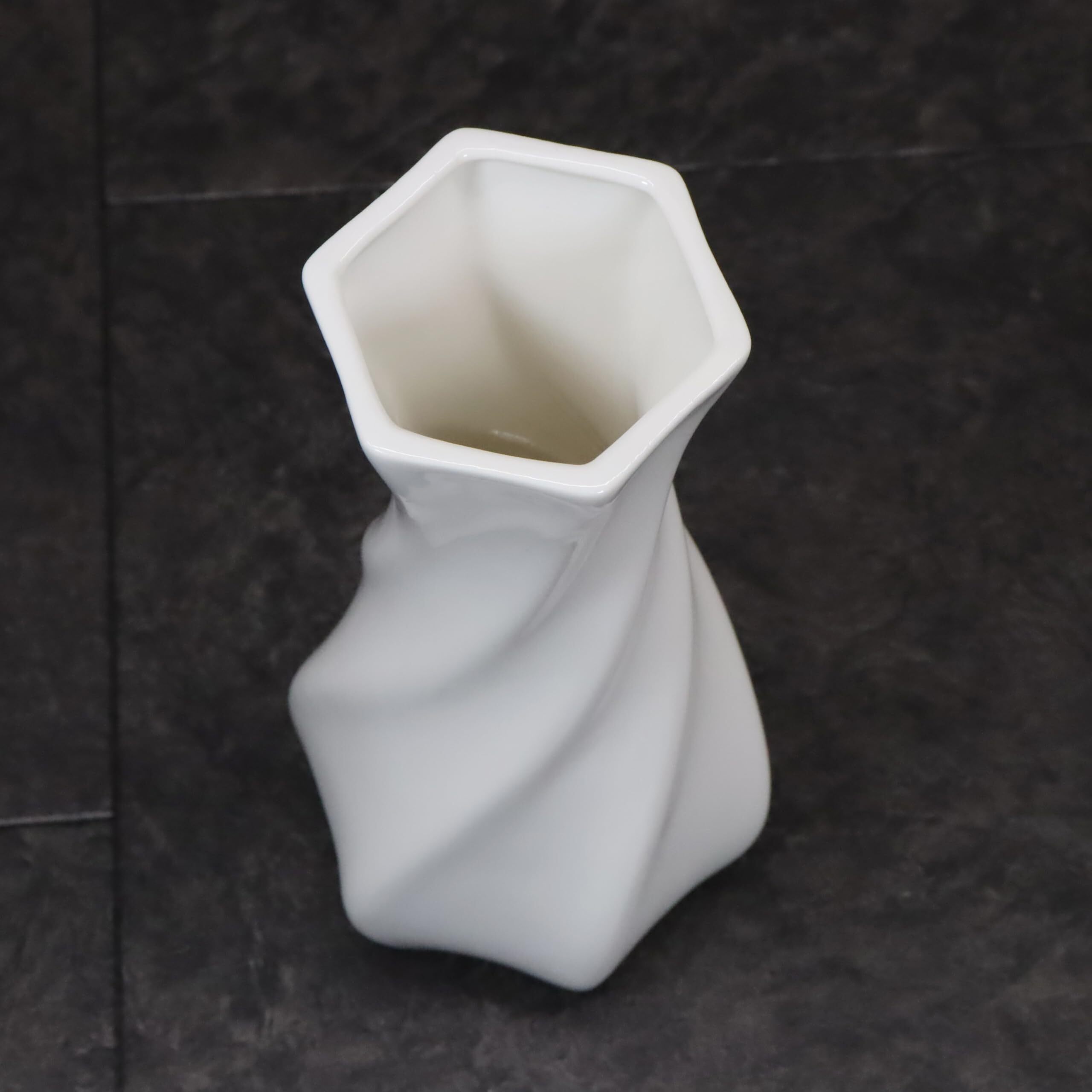 六角形のスタイリッシュな口部が特徴的な花瓶です。首の部分がキュッと締まっているので、お花をまとめて投げ込むだけで見映えよく広がります。