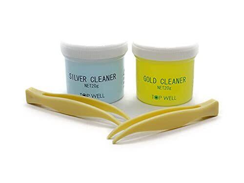 シルバークリーナーとゴールドクリーナーのセット 【シルバー用クリーナー】 シルバー製品の黒い変色が、この液体に10秒間漬けるだけでキレイになります! 宝石の付いたジュエリーやメッキ製品には使用できません。 ご使用の際は取扱説明書を必ずご確認下さい。 ■シルバー専用洗浄液 ■ピンセット付き ■内容量:20g ■口径:3.3cm 【ゴールド用クリーナー】 指輪などをちょっと洗浄するのに便利な、小さい20g。 宝石の付いたジュエリーやメッキ製品には使用できません。 ご使用の際は取扱説明書を必ずご確認下さい。 ■ゴールド専用洗浄液 ■ピンセット付き ■内容量:20g ■口径:3.3cm ※一度でも使用した場合、返品・交換は出来ません。