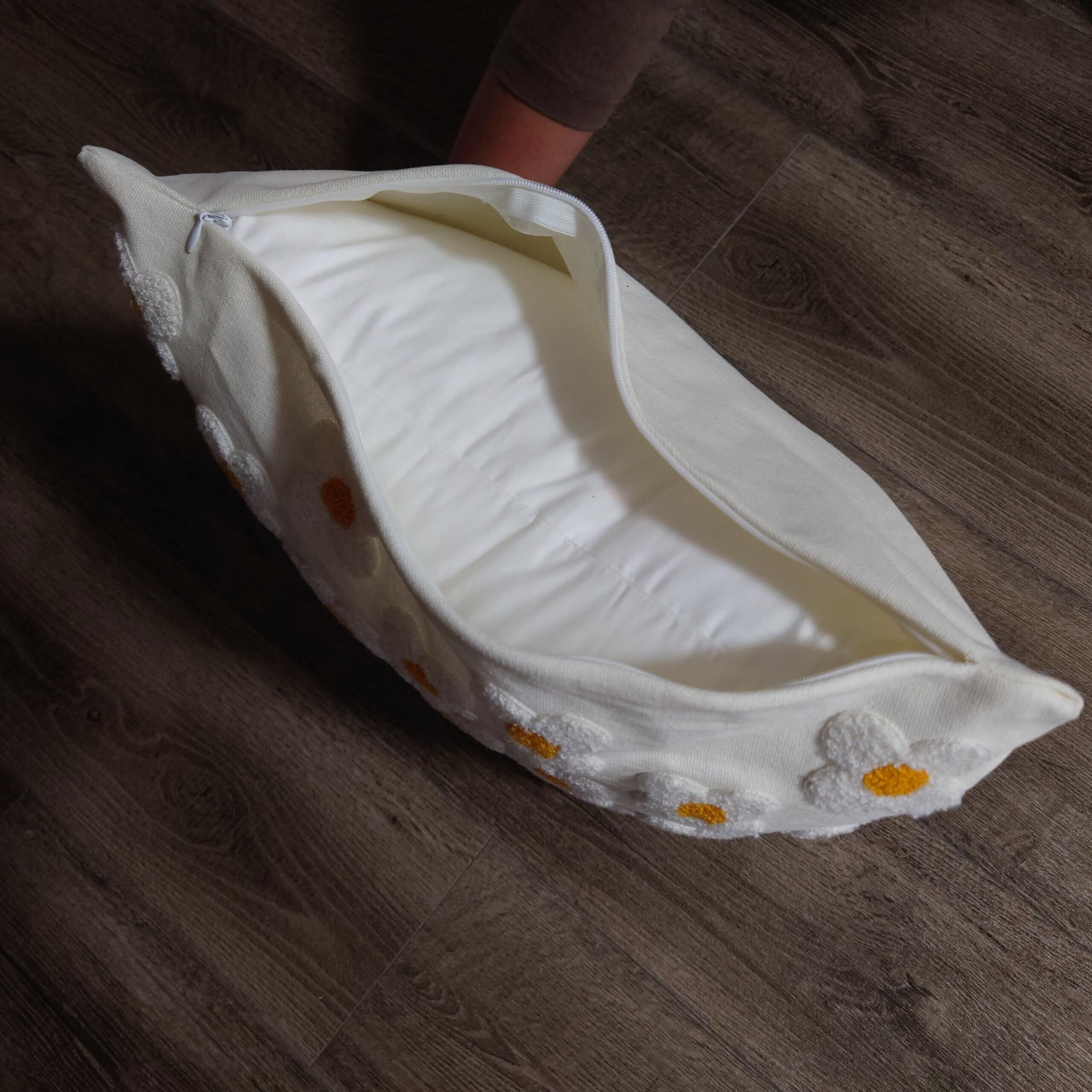 さわやかな色合いの生地の上はお花畑。かわいいけれども、子供っぽくなりすぎない、凛とした雰囲気もあるクッションカバーです。 花びらと花の中心はパイル刺繍。モコモコの手ざわりに癒されます。 中のクッションが出し入れしやすいサイドファスナー。 お部屋のイメージチェンジはクッションカバーから!気軽にできて効果バツグンですよ! ※裏面は表面と同じ生地の無地(花のパイル刺繍なし)です。