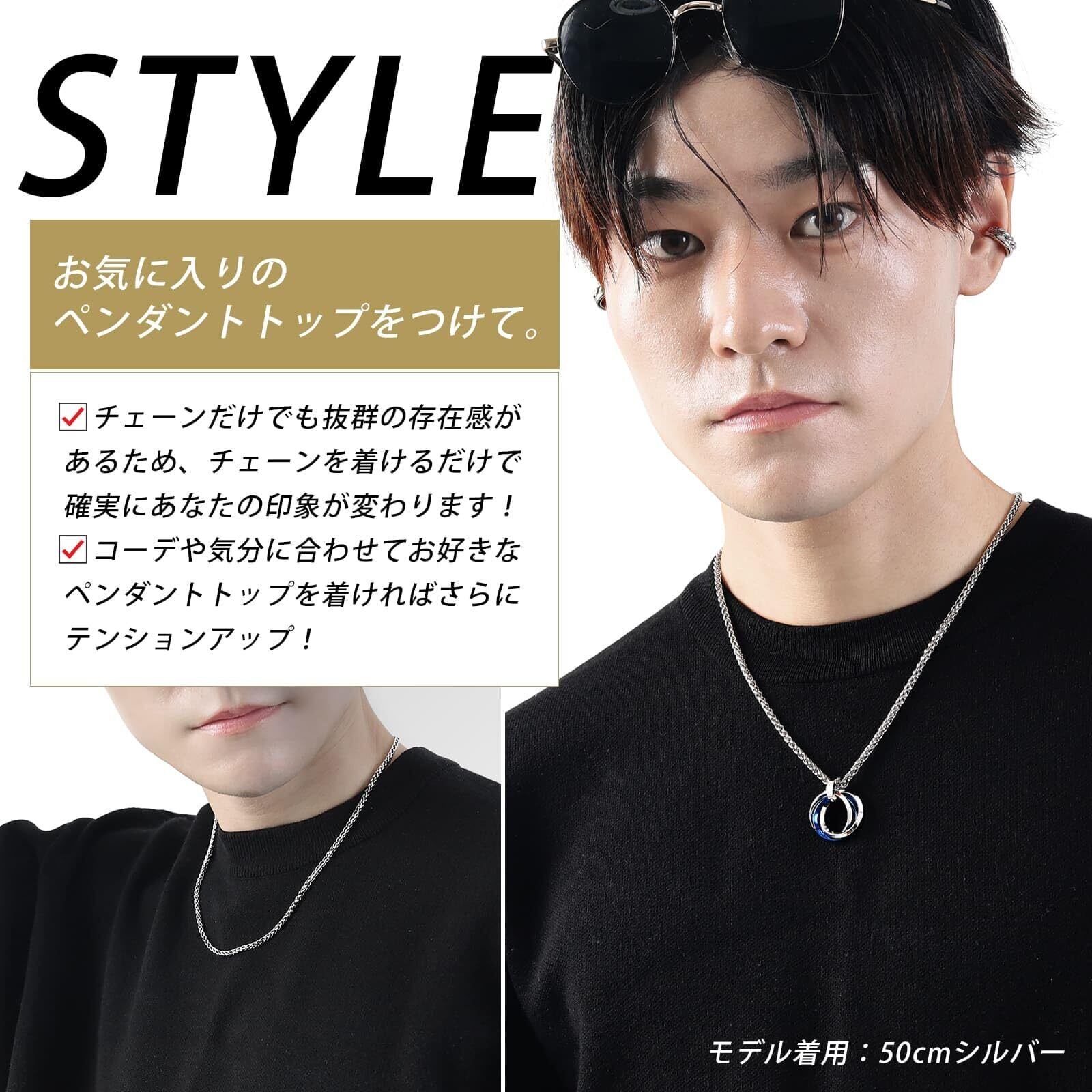 『長さ』一般的な3種類の長さをご用意しました。 50cm:首元に近く丸首のシャツでも隠れません。レディースにもおすすめです 60cm:胸元まで下がり、アクセサリートップとの相性もバツグン! 70cm:ユルッとした長さで単品でおしゃれにつけるのに最適です