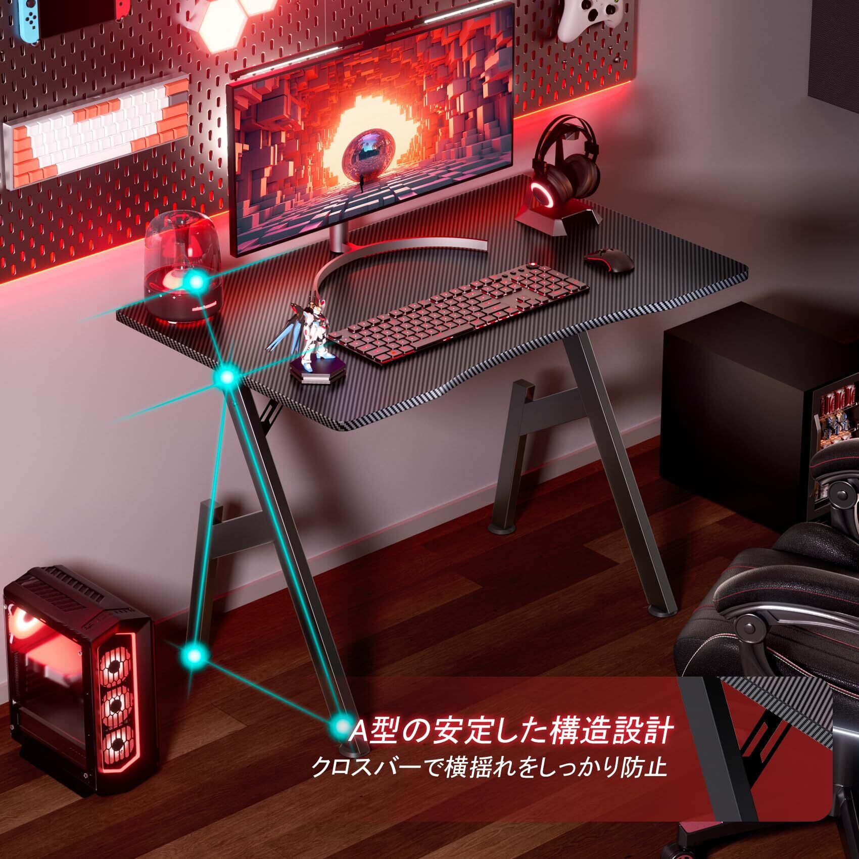 【安定したA字型脚デザイン】ゲーミングデスク独自のA字型脚は、最も安定した三角形の支持構造、優れた耐荷重性、そして広い足元スペースを提供します。テーブルの脚は厚みのある金属と補強されたクロスビームで作られており、最大耐荷重は通常100~150kgを超えます。調整可能な脚により、不均一な表面でも安定性を確保します。このデスクはeスポーツプレイヤーにとって堅牢なプラットフォームを提供し、パフォーマンスと実用性の両方を兼ね備えた理想的な選択肢です。