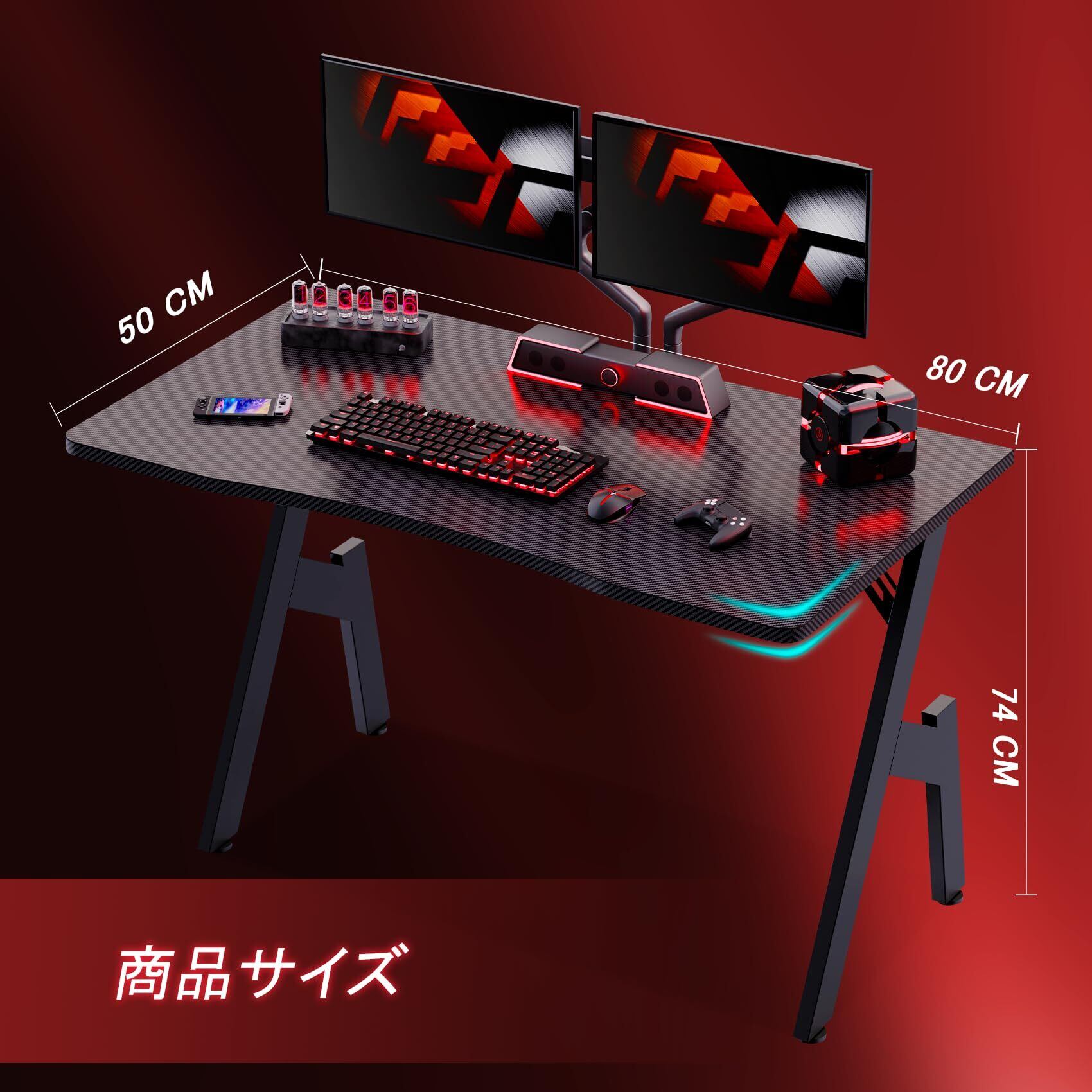 【モダンなカーボンファイバー外装】このゲーミングデスクは、幅80cm x 奥行50cm x 高さ74cmで、天板は15mmの厚みがあり、耐荷重性を高めています。ブラックのカーボンファイバー天板は、耐久性に優れたカーボンファイバー製で、独特の質感と滑らかな手触りを実現し、モダンで高級感を醸し出します。表面は防水性と耐傷性に優れているため、毎日のお手入れが簡単で、ゲーミングスペースにテクノロジーの雰囲気を添えます。