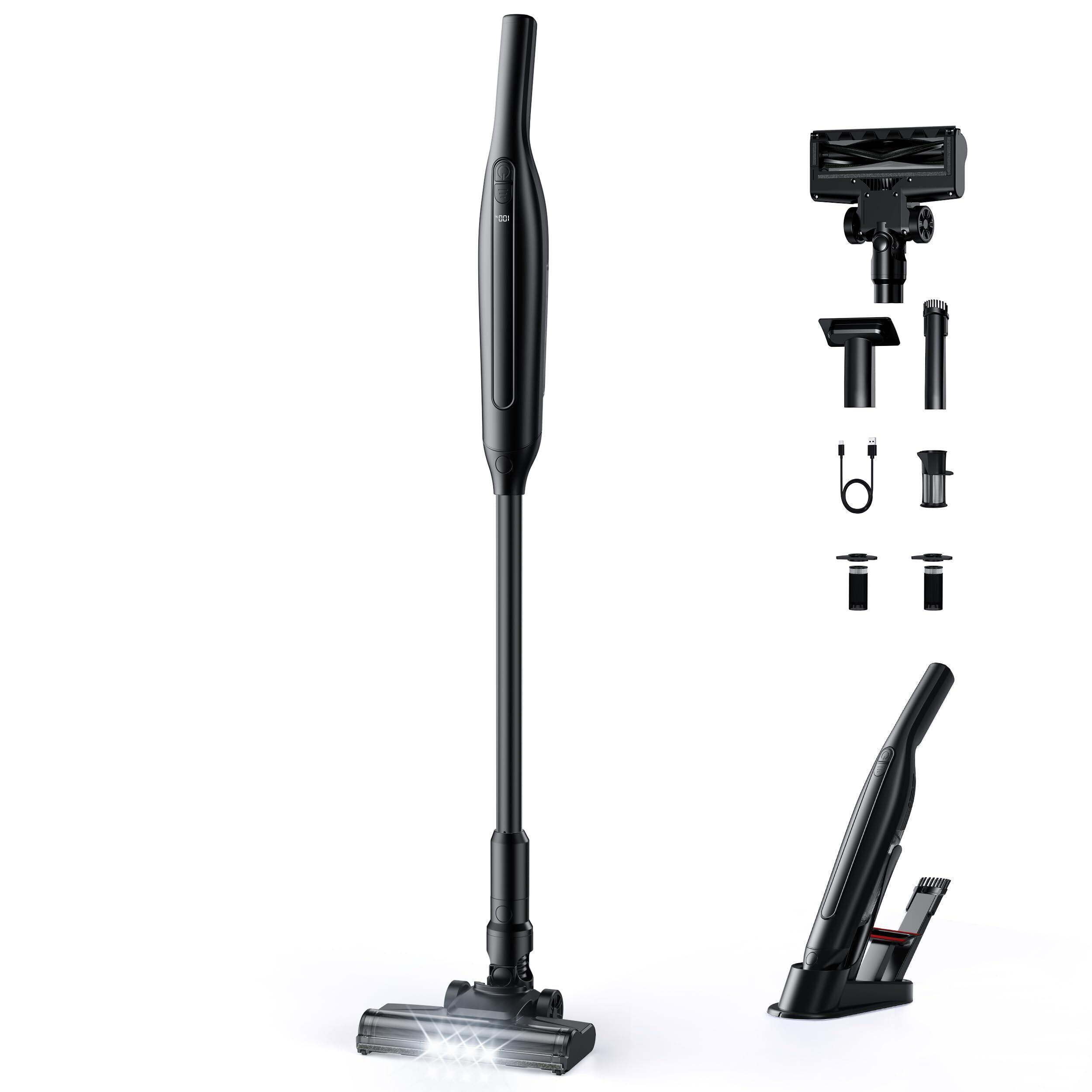 掃除機コードレス 軽量 強力【2025最新型!業界初!55KPa強力吸引&超軽量0.6kg&スタンド不要の自立式&Type-C充電式&LEDライト】サイクロン式 スティック掃除機 2WAY 低騒音 50分連続稼働 HEPA多重濾過 コードレス掃除機 畳/カーペット/フローリング/ペット/ソファー/車用/隙間/本棚/階段対応 V字型自走式ローラブラシ 3年ほしょう Feunensi ブラック 黒