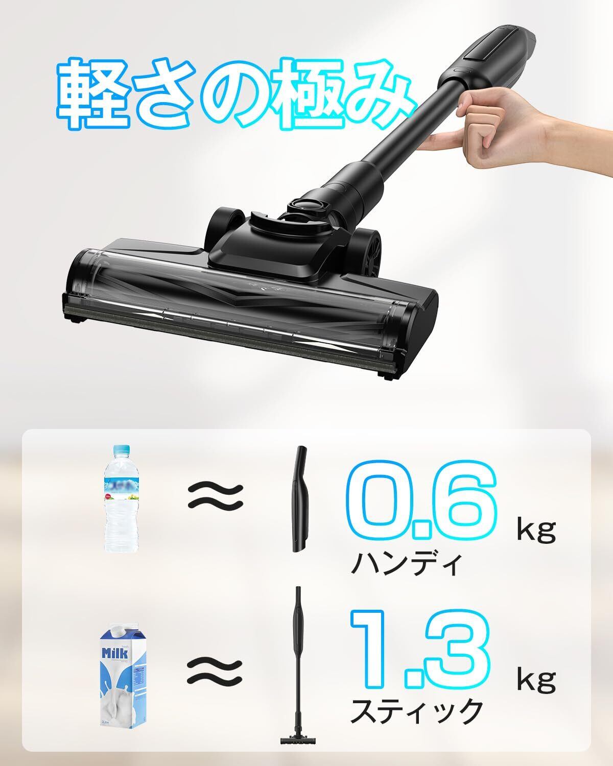 ●【掃除のストレス、そろそろ手放しませんか?】コードが絡まったり、掃除機が重くて腕が疲れることはありませんか?コードレス掃除機 EB102 が、毎日の掃除をより快適にします。◆【超軽量設計】スティックモードはわずか1.3kg、ハンディモードは約0.6kg。片手で軽く持ち上げられ、スムーズに操作できます。重い掃除機による疲れを軽減します。◆【自立式】スタンド不要で、自立設計を採用。床用ブラシヘッドにはロック機構を搭載し、軽く置くだけで固定されます。壁に立てかける必要がなく、使いたいときにすぐ手に取れます。掃除後はその場に置くだけで収納可能。狭い玄関やトイレ、車のトランクでもスッキリ片付けられます。