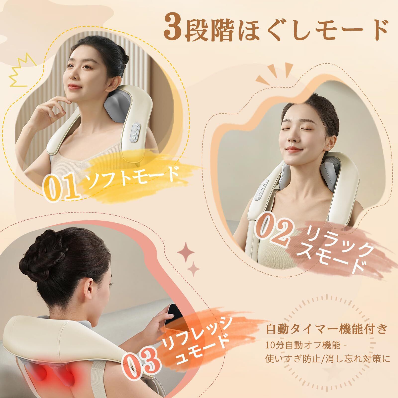 【本格首元ケア&自動タイマー機能】 強靭でしっかりフィットする2本アームと専用ケアボールが連動。首から肩、背中上部まで広いエリアをしっかりキャッチし、深く幅広い動きで筋肉をほぐし、こわばりを解消します。さらに、自動タイマー機能を搭載。10分でネックリラックスを実現。使用後は自動的に電源がオフ。使いすぎ防止や電源切り忘れの心配がなく、毎日安心のネックケア。