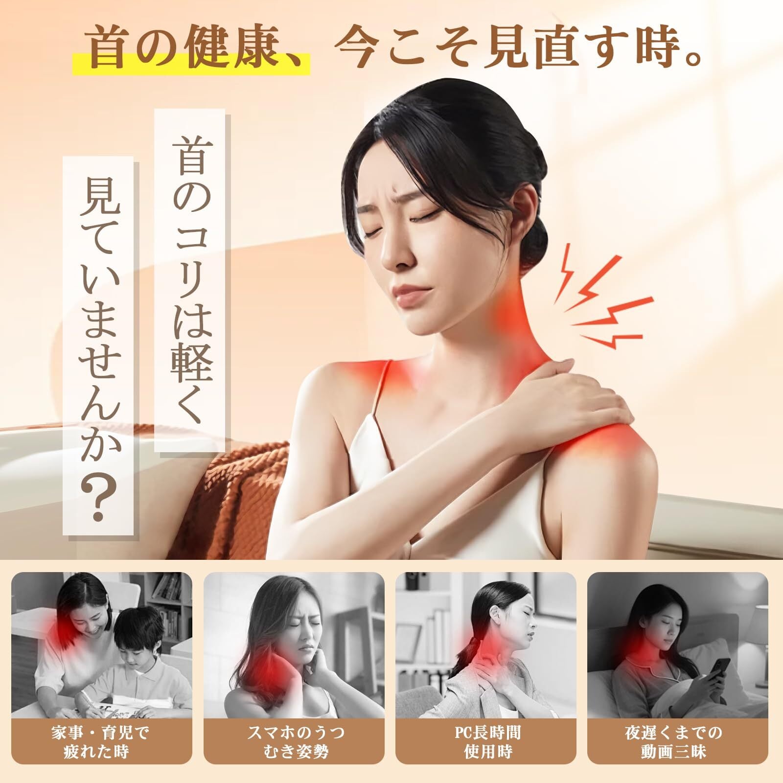 【温熱機能】 この首肩ケアには温熱機能も搭載されており、2段階の温度調節が可能です。電源ON時は非加熱状態からのスタートとなります。心地よい温熱が首リフレッシュをサポート。揉みケアと温熱でトータルな首元ケアを実現します。一日の凝りや疲れをすっきりほぐし、リラックスした心地よいひとときをお届けします。日常のリフレッシュや肩こり対策として活躍します。