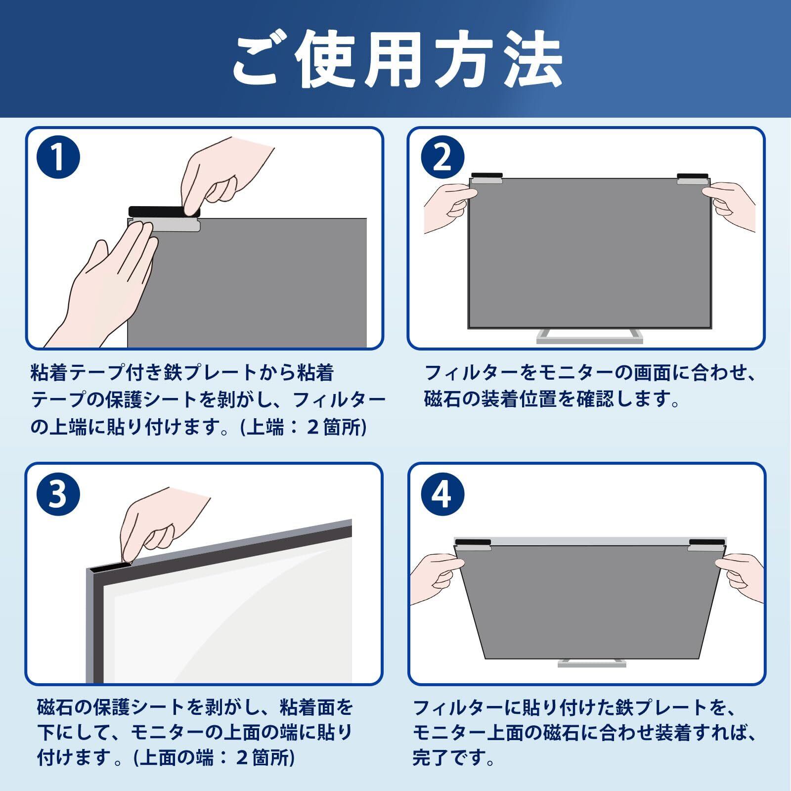 【ご使用方法】1. 粘着テープ付き鉄プレートから粘着テープの保護シートを剥がし、フィルターの上端(左右2ヶ所)に貼り付けます。2. フィルターをモニターの画面に合わせ、磁石の装着位置を確認してください。3. 磁石の保護シートを剥がして、モニター上部の両端に貼り付けます。4. フィルターに貼り付けた鉄パーツをモニター上部に合わせて装着してください。