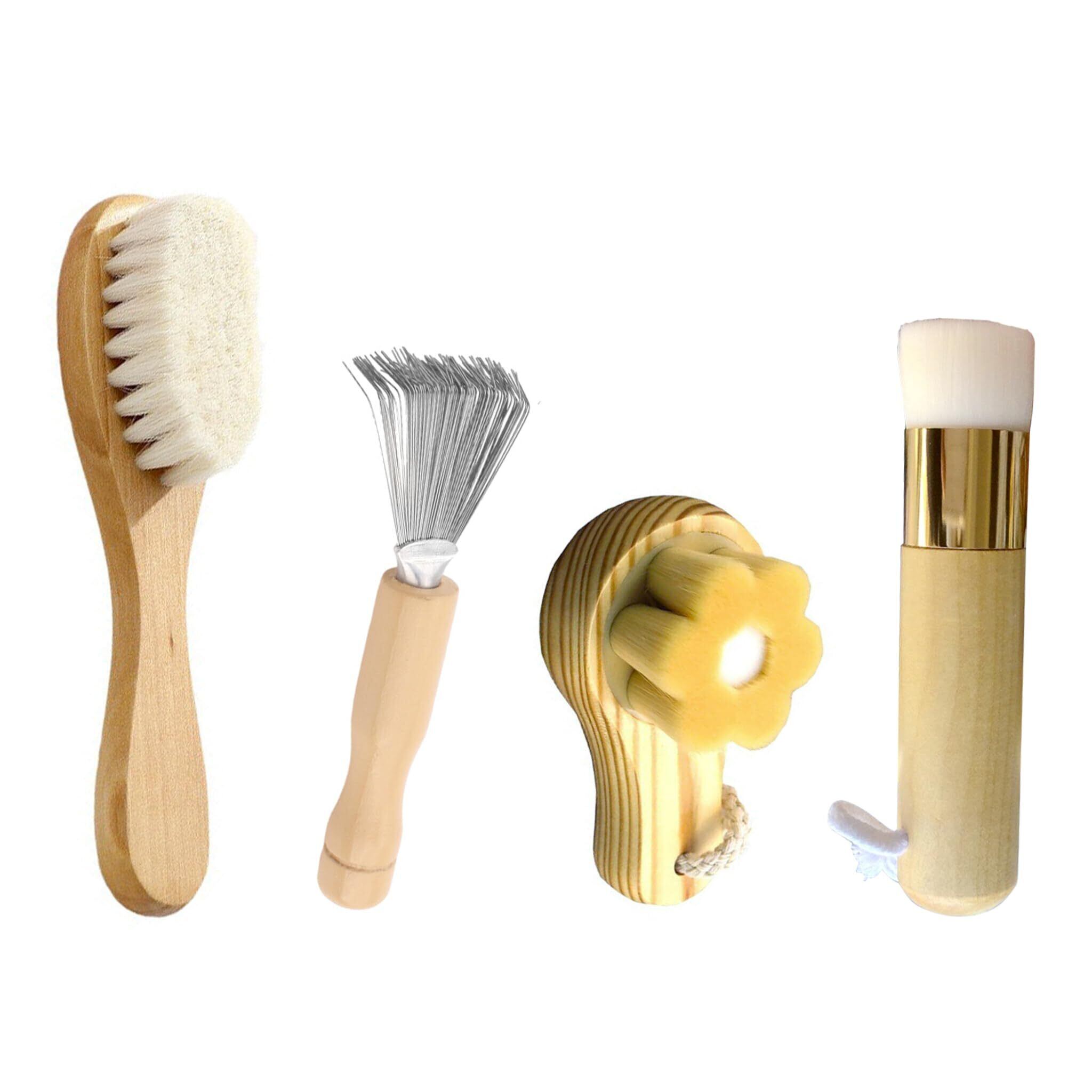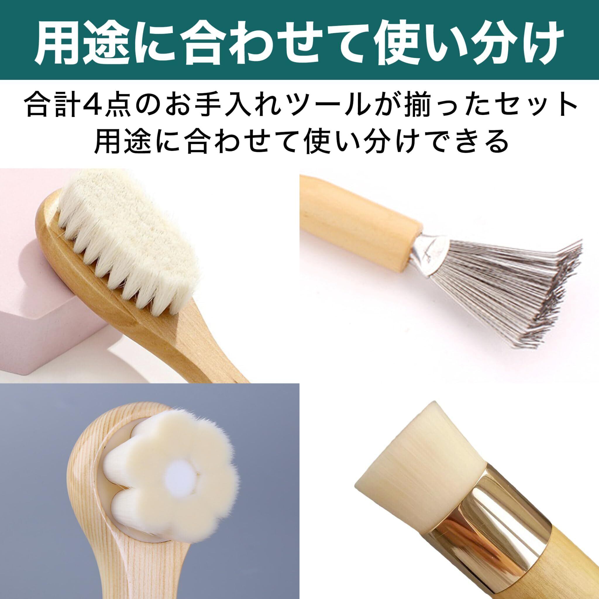 セット内容:4点セット 羊毛ブラシ(材質:羊毛、木 サイズ:約15×3cm 重さ:約38g)、起毛ブラシ(材質:ステンレス、木 サイズ:約11×3.5cm 重さ:約12.5g)、極細ブラシA(材質:木 毛の長さ:約2cm サイズ:約10×5.5×3.7cm 重さ:約50.8g)、極細ブラシB(材質:木、合成繊維 毛の長さ:約2cm サイズ:約12.5×2.5cm) ※天然素材の為、色味や木目の出方に個体差があります。
